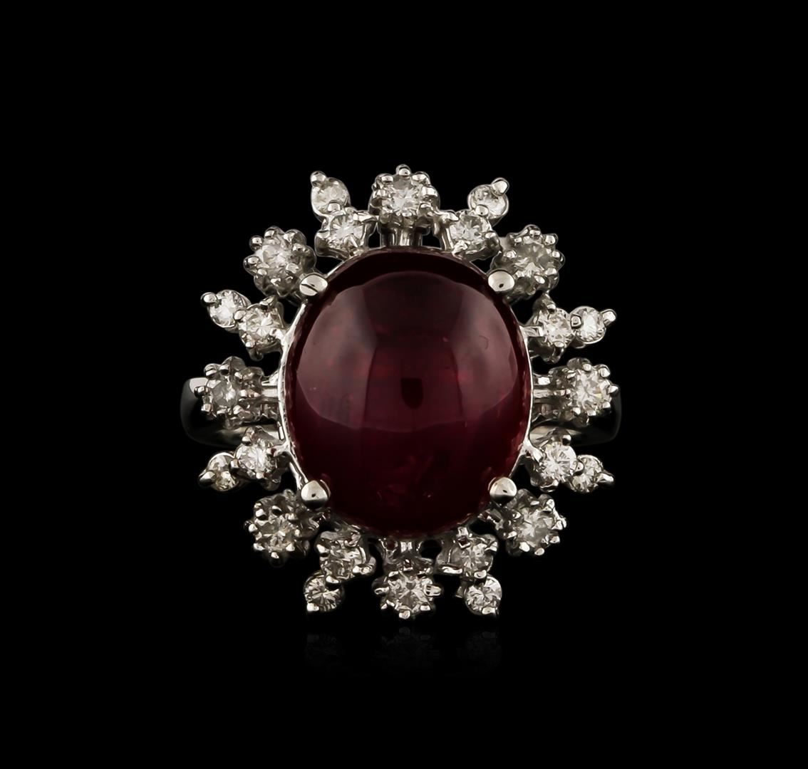 One electronically tested 14KT white gold ladies cast ruby and diamond ring with a bright polish finish. Identified with markings of "14K". Condition is new. Containing: One prong set oval cabochon cut natural ruby, measuring 12.90 x 11.00 x 7.20mm, approximate weight of 11.03ct., clarity is heavily included, type II, medium dark, moderately strong, strongly purplish red color, (GIA stpR 6/4), cut is good. Twenty-Four prong set round brilliant cut diamonds, measuring 2.00 - 1.50 x 1.05mm (depth est.) approximate total weight of 24 Stones = 0.47ct. Clarity: SI-1 to I-1. Color: I - J, Cut is Good. Colored gemstones are presumed to have been subjected to commonly used enhancement processes, All diamonds and colored gemstones are graded in the mounting, unless otherwise stated. Total Weight of Colored Stones 11.03ct. Total Weight of Diamonds 0.47ct. Total Weight of Ring 7.60 grams. GGL Appraised at $3,885.00.