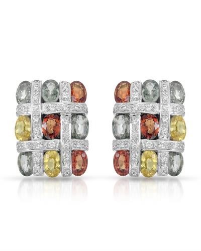 14KT White Gold 11.03ctw Multi Color Sapphire and Diamond Earrings. (18) Multi color sapphires with a total weight of 11.03cts. (60) Round Diamonds with a total weight of 0.77cts with a color of I and clarity of I-1. Measuring 21mm x 16mm. Total weight of these earrings are 12.68 grams.