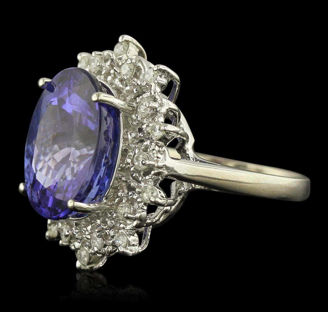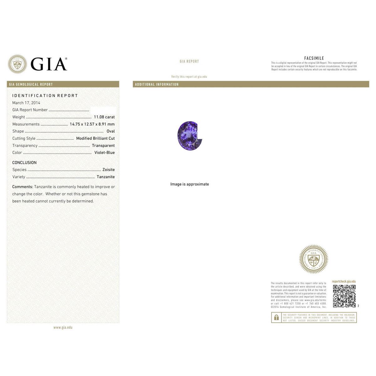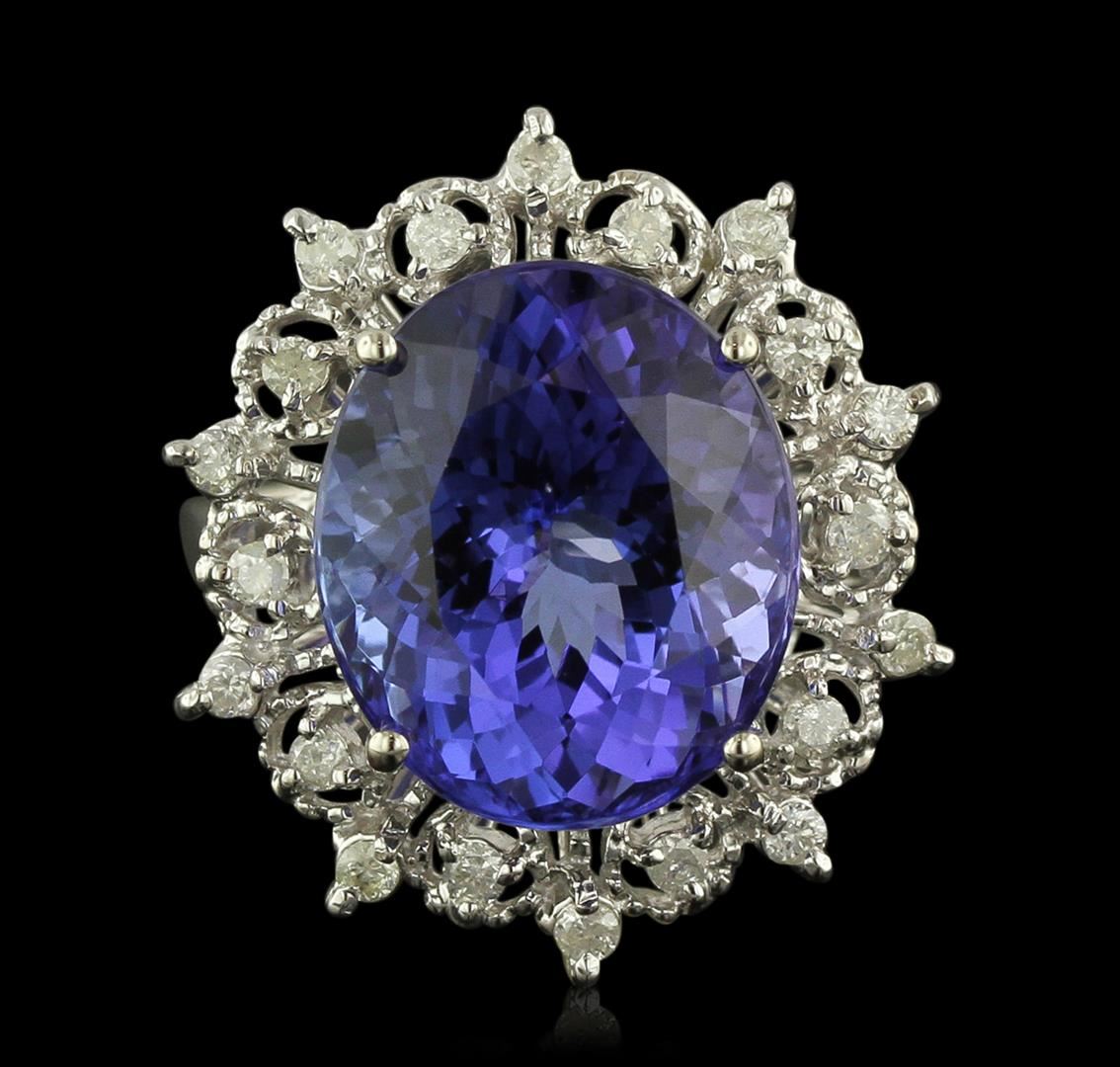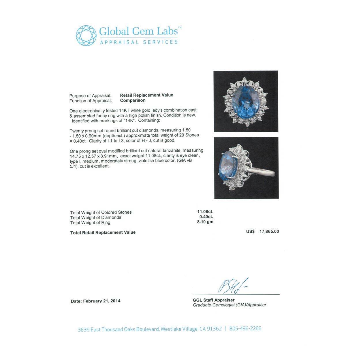 One electronically tested 14KT white gold Ladies combination cast & assembled fancy ring with a high polish finish. Condition is new. Identified with markings of "14K". Containing: Twenty prong set round brilliant cut diamonds, measuring 1.50 - 1.50 x 0.90mm (depth est.) approximate. Total Weight of 20 Stones = 0.40ct. Clarity: I-1 to I-3. Color: H - J, Cut is Good. One prong set oval modified brilliant cut natural tanzanite, measuring 14.75 x 12.57 x 8.91mm, exact weight 11.08ct., clarity is eye clean, type I, medium, moderately strong, violetish blue color, (GIA vB 5/4), cut is excellent. GIA Report: 1156964541.Total Weight of Colored Stones 11.08ct. Total Weight of Diamonds 0.40ct. Total Weight of Ring 8.10 grams. GGL Appraised at $17,865.00.