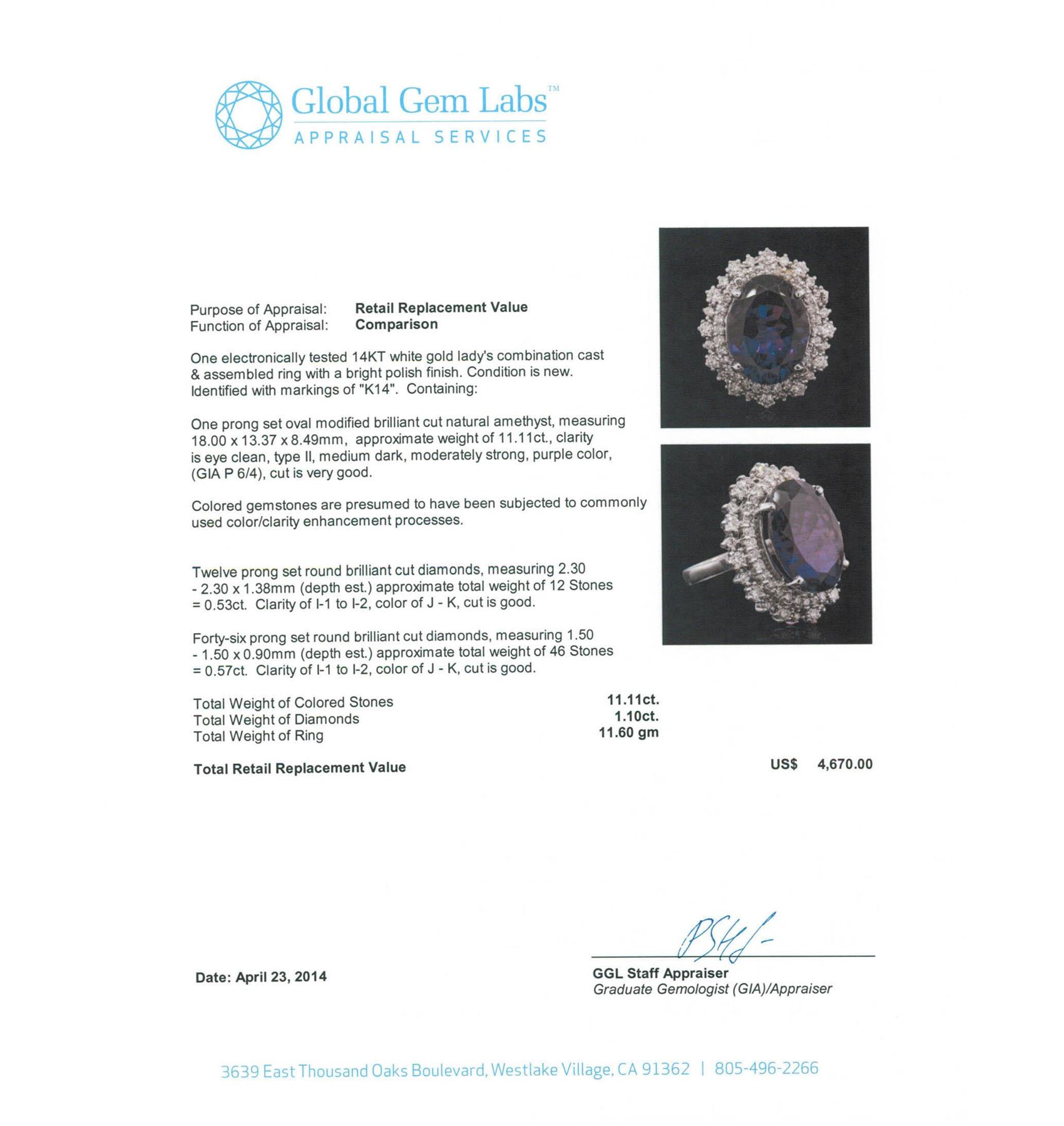 One electronically tested 14KT white gold Ladies combination cast & assembled ring with a bright polish finish. Condition is new. Identified with markings of "K14". Containing: One prong set oval modified brilliant cut natural amethyst, measuring 18.00 x 13.37 x 8.49mm, approximate weight of 11.11ct., clarity is eye clean, type II, medium dark, moderately strong, purple color, (GIA P 6/4), cut is very good. Colored gemstones are presumed to have been subjected to commonly used color/clarity enhancement processes. Twelve prong set round brilliant cut diamonds, measuring 2.30 - 2.30 x 1.38mm (depth est.) approximate. Total Weight of 12 Stones = 0.53ct. Clarity: I-1 to I-2. Color: J - K, Cut is Good. Forty-Six prong set round brilliant cut diamonds, measuring 1.50 - 1.50 x 0.90mm (depth est.) approximate. Total Weight of 46 Stones = 0.57ct. Clarity: I-1 to I-2. Color: J - K, Cut is Good. Total Weight of Colored Stones 11.11ct. Total Weight of Diamonds 1.10ct. Total Weight of Ring 11.60 grams. GGL Appraised at $4,670.00.
