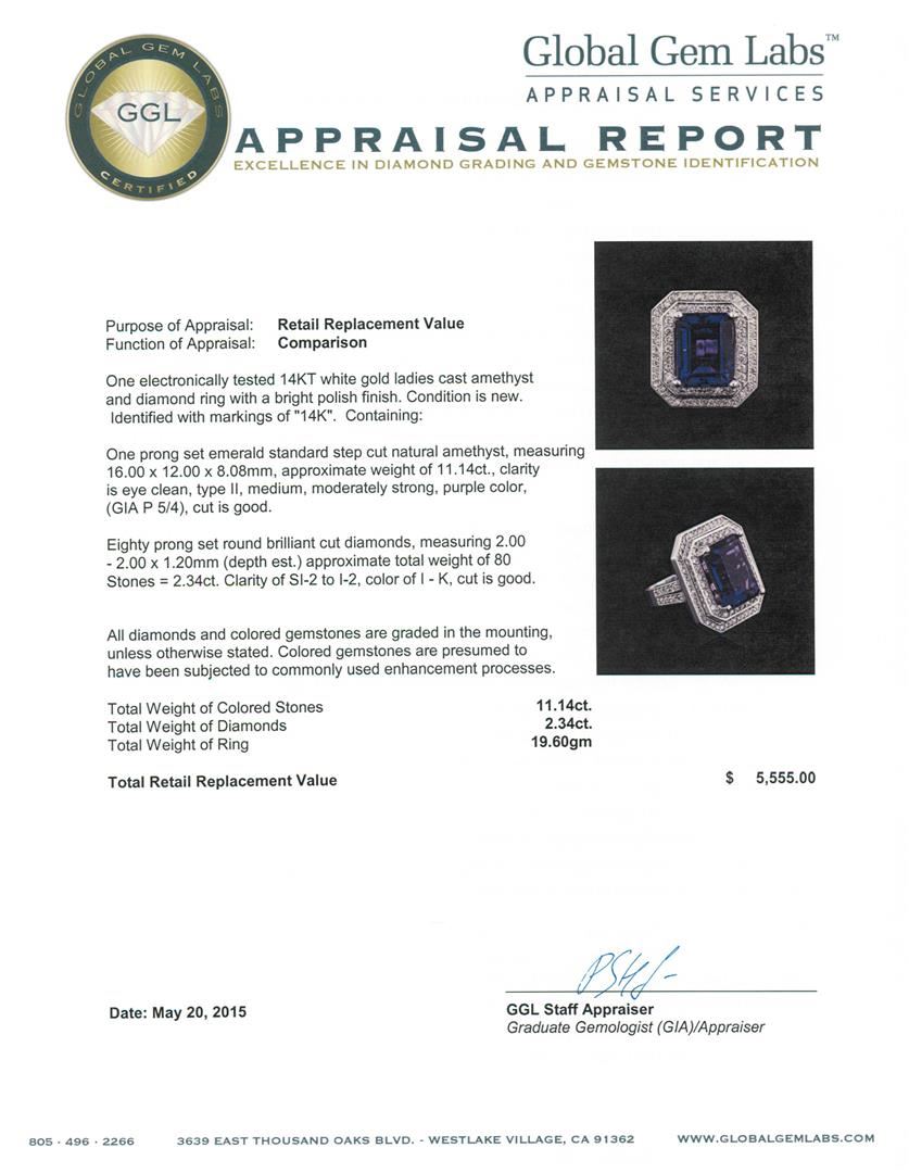 One electronically tested 14KT white gold ladies cast amethyst and diamond ring with a bright polish finish. Identified with markings of "14K". Condition is new. Containing: One prong set emerald standard step cut natural amethyst, measuring 16.00 x 12.00 x 8.08mm, approximate weight of 11.14ct., clarity is eye clean, type II, medium, moderately strong, purple color, (GIA P 5/4), cut is good. Eighty prong set round brilliant cut diamonds, measuring 2.00 - 2.00 x 1.20mm (depth est.) approximate total weight of 80 Stones = 2.34ct. Clarity: SI-2 to I-2. Color: I - K, Cut is Good. All diamonds and colored gemstones are graded in the mounting, unless otherwise stated. Colored gemstones are presumed to have been subjected to commonly used enhancement processes. Total Weight of Colored Stones 11.14ct. Total Weight of Diamonds 2.34ct. Total Weight of Ring 19.60 grams. GGL Appraised at $5,555.00.