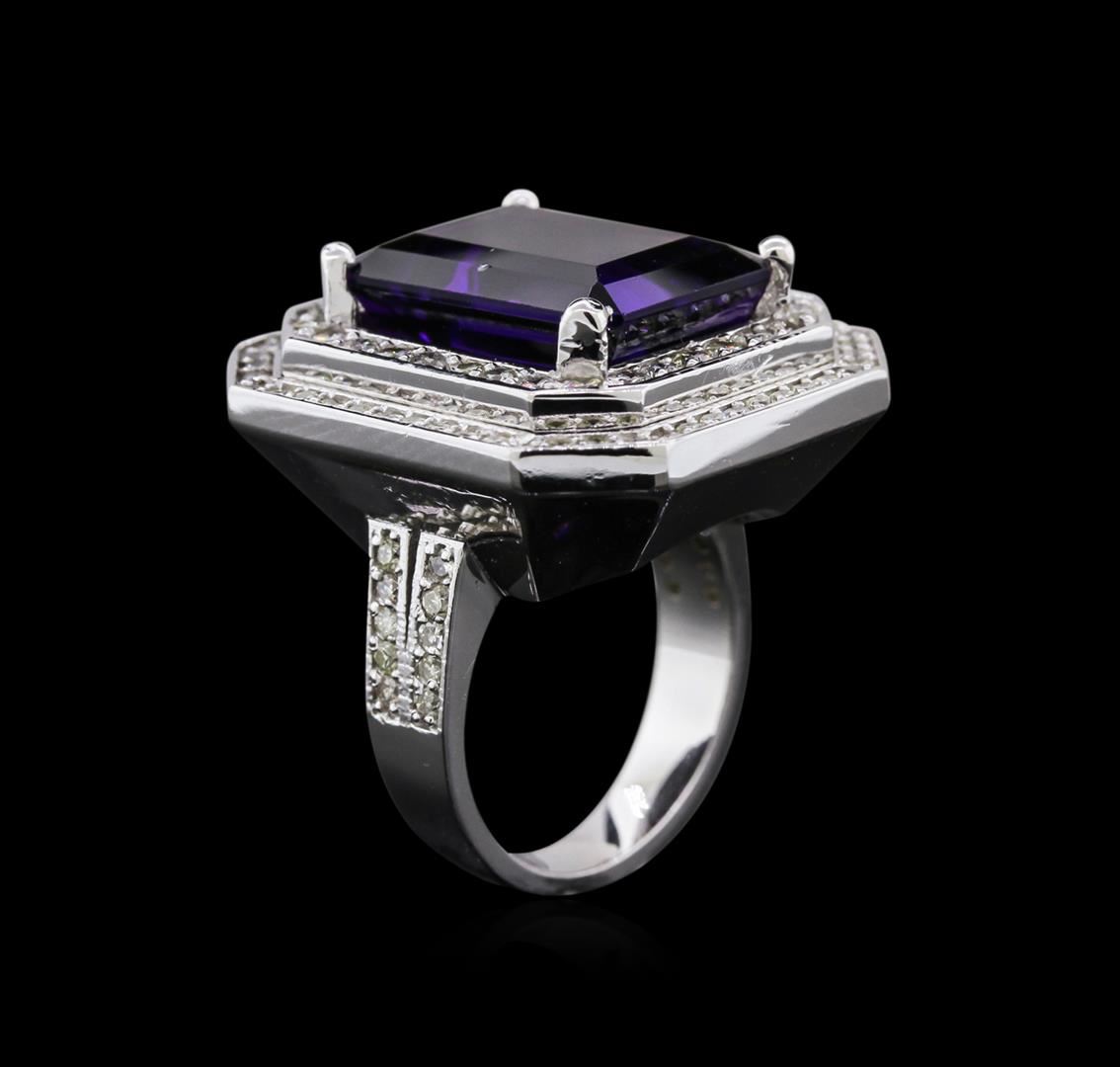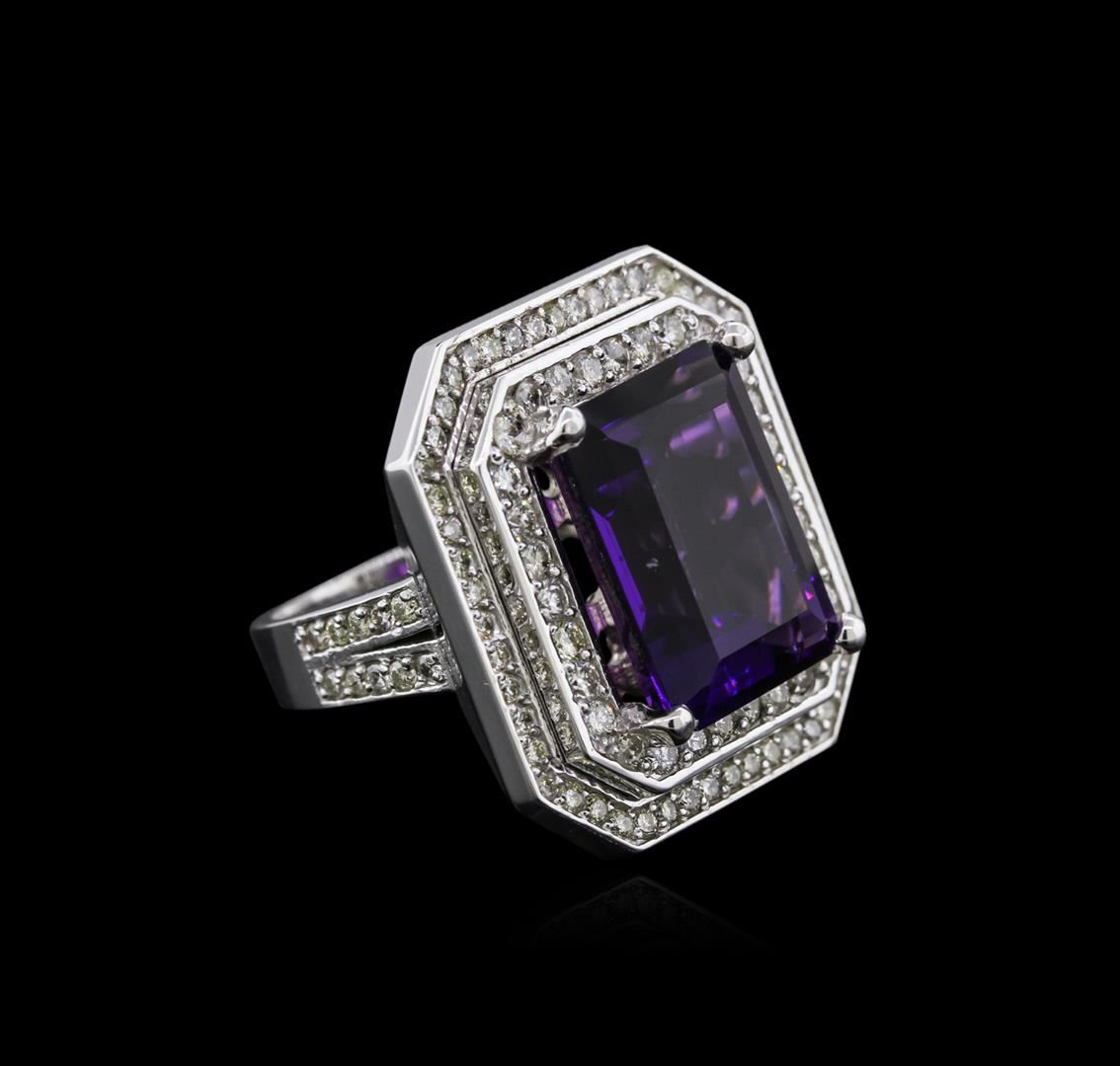 One electronically tested 14KT white gold ladies cast amethyst and diamond ring with a bright polish finish. Identified with markings of "14K". Condition is new. Containing: One prong set emerald standard step cut natural amethyst, measuring 16.00 x 12.00 x 8.08mm, approximate weight of 11.14ct., clarity is eye clean, type II, medium, moderately strong, purple color, (GIA P 5/4), cut is good. Eighty prong set round brilliant cut diamonds, measuring 2.00 - 2.00 x 1.20mm (depth est.) approximate total weight of 80 Stones = 2.34ct. Clarity: SI-2 to I-2. Color: I - K, Cut is Good. All diamonds and colored gemstones are graded in the mounting, unless otherwise stated. Colored gemstones are presumed to have been subjected to commonly used enhancement processes. Total Weight of Colored Stones 11.14ct. Total Weight of Diamonds 2.34ct. Total Weight of Ring 19.60 grams. GGL Appraised at $5,555.00.
