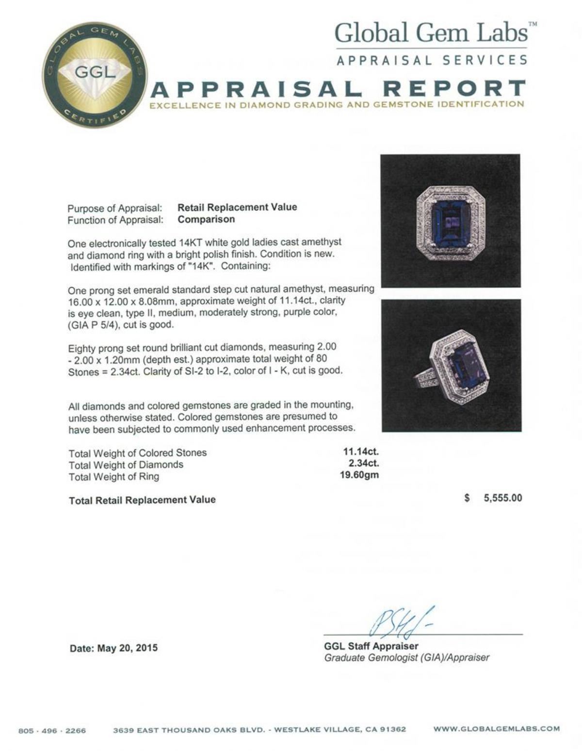 One electronically tested 14KT white gold ladies cast amethyst and diamond ring with a bright polish finish. Identified with markings of "14K". Condition is new. Containing: One prong set emerald standard step cut natural amethyst, measuring 16.00 x 12.00 x 8.08mm, approximate weight of 11.14ct., clarity is eye clean, type II, medium, moderately strong, purple color, (GIA P 5/4), cut is good. Eighty prong set round brilliant cut diamonds, measuring 2.00 - 2.00 x 1.20mm (depth est.) approximate total weight of 80 Stones = 2.34ct. Clarity: SI-2 to I-2. Color: I - K, Cut is Good. All diamonds and colored gemstones are graded in the mounting, unless otherwise stated. Colored gemstones are presumed to have been subjected to commonly used enhancement processes. Total Weight of Colored Stones 11.14ct. Total Weight of Diamonds 2.34ct. Total Weight of Ring 19.60 grams. GGL Appraised.