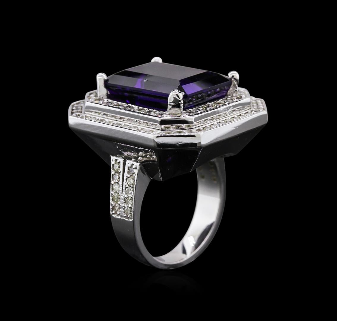 One electronically tested 14KT white gold ladies cast amethyst and diamond ring with a bright polish finish. Identified with markings of "14K". Condition is new. Containing: One prong set emerald standard step cut natural amethyst, measuring 16.00 x 12.00 x 8.08mm, approximate weight of 11.14ct., clarity is eye clean, type II, medium, moderately strong, purple color, (GIA P 5/4), cut is good. Eighty prong set round brilliant cut diamonds, measuring 2.00 - 2.00 x 1.20mm (depth est.) approximate total weight of 80 Stones = 2.34ct. Clarity: SI-2 to I-2. Color: I - K, Cut is Good. All diamonds and colored gemstones are graded in the mounting, unless otherwise stated. Colored gemstones are presumed to have been subjected to commonly used enhancement processes. Total Weight of Colored Stones 11.14ct. Total Weight of Diamonds 2.34ct. Total Weight of Ring 19.60 grams. GGL Appraised.