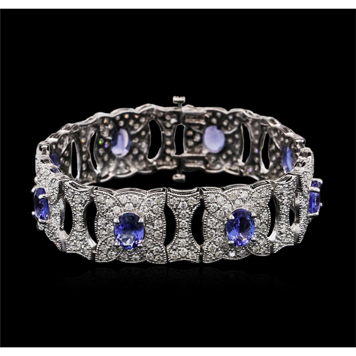 One electronically tested 14KT white gold ladies cast tanzanite and diamond bracelet with a hidden box clasp with a bright polish finish. Measurements: 7" in length Condition is new. Containing: Eight prong set oval modified brilliant cut natural tanzanites, measuring 8.00 x 6.20 x 4.03mm, approximate total weight of 11.28ct., clarity is eye clean, type I, medium, moderately strong, violet color, (GIA V 5/4), cut is good. Three Hundred Thirty-Six prong set round brilliant cut diamonds, measuring 1.70 - 1.50 x 0.96mm (depth est.) approximate total weight of 336 Stones = 5.01ct. Clarity: SI-1 to I-1. Color: I - J, Cut is Good. Colored gemstones are presumed to have been subjected to commonly used enhancement processes. All diamonds and colored gemstones are graded in the mounting, unless otherwise stated. Total Weight of Colored Stones 11.28ct. Total Weight of Diamonds 5.01ct. Total Weight of Bracelet 36.20 grams. GGL Appraised at $24,210.00.