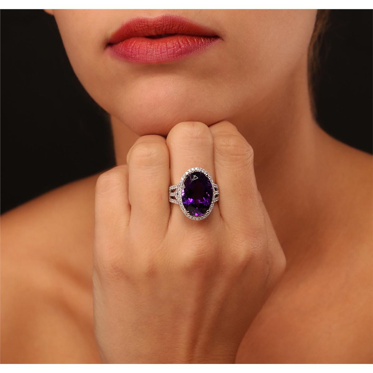 One electronically tested 14KT white gold ladies cast amethyst and diamond ring with a bright polish finish. Condition is new, good workmanship. The featured amethyst is set within a diamond bezel supported by diamond set split shoulders, completed by a three and one-half millimeter wide band. Identified with markings of "14K". Containing: One prong set oval mixed cut natural amethyst, measuring 18.00 x 12.90 x 8.50mm, 6%. bulge factor, approximate weight of 11.51ct., clarity is eye clean, type II, dark, moderately strong, reddish purple color, (GIA rP 7/4), cut is good. Transmitting light with no distortion, transparent. Colored Stone Grading Report attached. Graded in the setting. Eighty-Eight prong set round brilliant cut diamonds, measuring 1.60 - 1.40 x 0.90mm (depth est.) approximate. Total Weight of 88 Stones = 1.21ct. Graded in the setting. Clarity: SI-1 to I-1. Color: G - I. Total Weight of Colored Stones 11.51ct. Total Weight of Diamonds 1.21ct. Total Weight of Ring 9.32grams. AIG Appraised at $5,710.00.