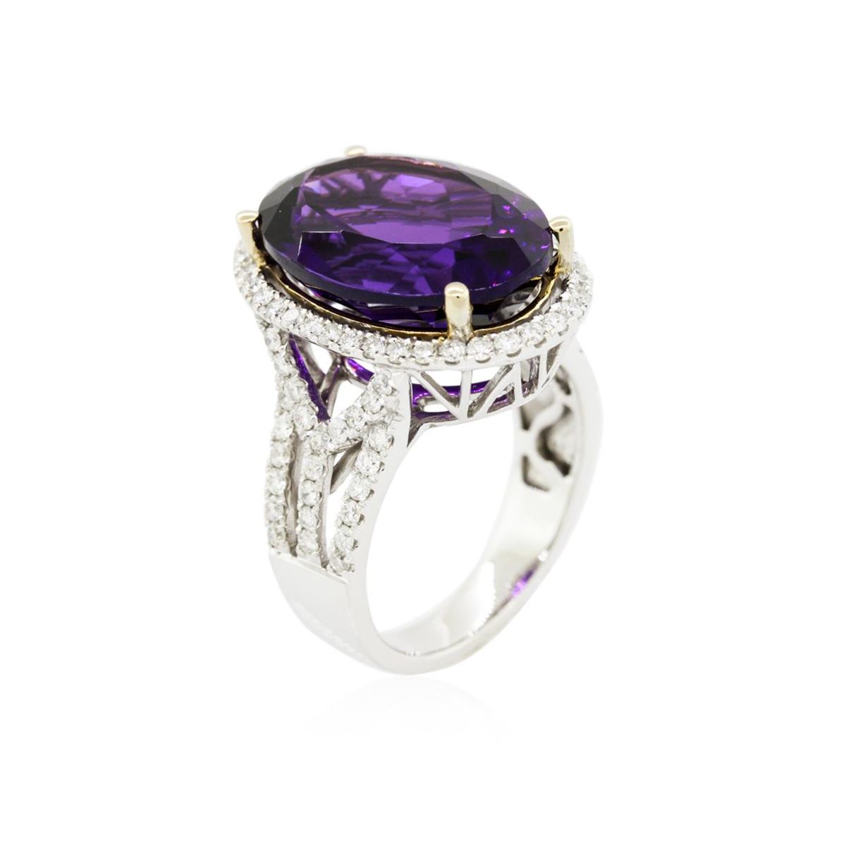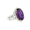 One electronically tested 14KT white gold ladies cast amethyst and diamond ring with a bright polish finish. Condition is new, good workmanship. The featured amethyst is set within a diamond bezel supported by diamond set split shoulders, completed by a three and one-half millimeter wide band. Identified with markings of "14K". Containing: One prong set oval mixed cut natural amethyst, measuring 18.00 x 12.90 x 8.50mm, 6%. bulge factor, approximate weight of 11.51ct., clarity is eye clean, type II, dark, moderately strong, reddish purple color, (GIA rP 7/4), cut is good. Transmitting light with no distortion, transparent. Colored Stone Grading Report attached. Graded in the setting. Eighty-Eight prong set round brilliant cut diamonds, measuring 1.60 - 1.40 x 0.90mm (depth est.) approximate. Total Weight of 88 Stones = 1.21ct. Graded in the setting. Clarity: SI-1 to I-1. Color: G - I. Total Weight of Colored Stones 11.51ct. Total Weight of Diamonds 1.21ct. Total Weight of Ring 9.32grams. AIG Appraised at $5,710.00.