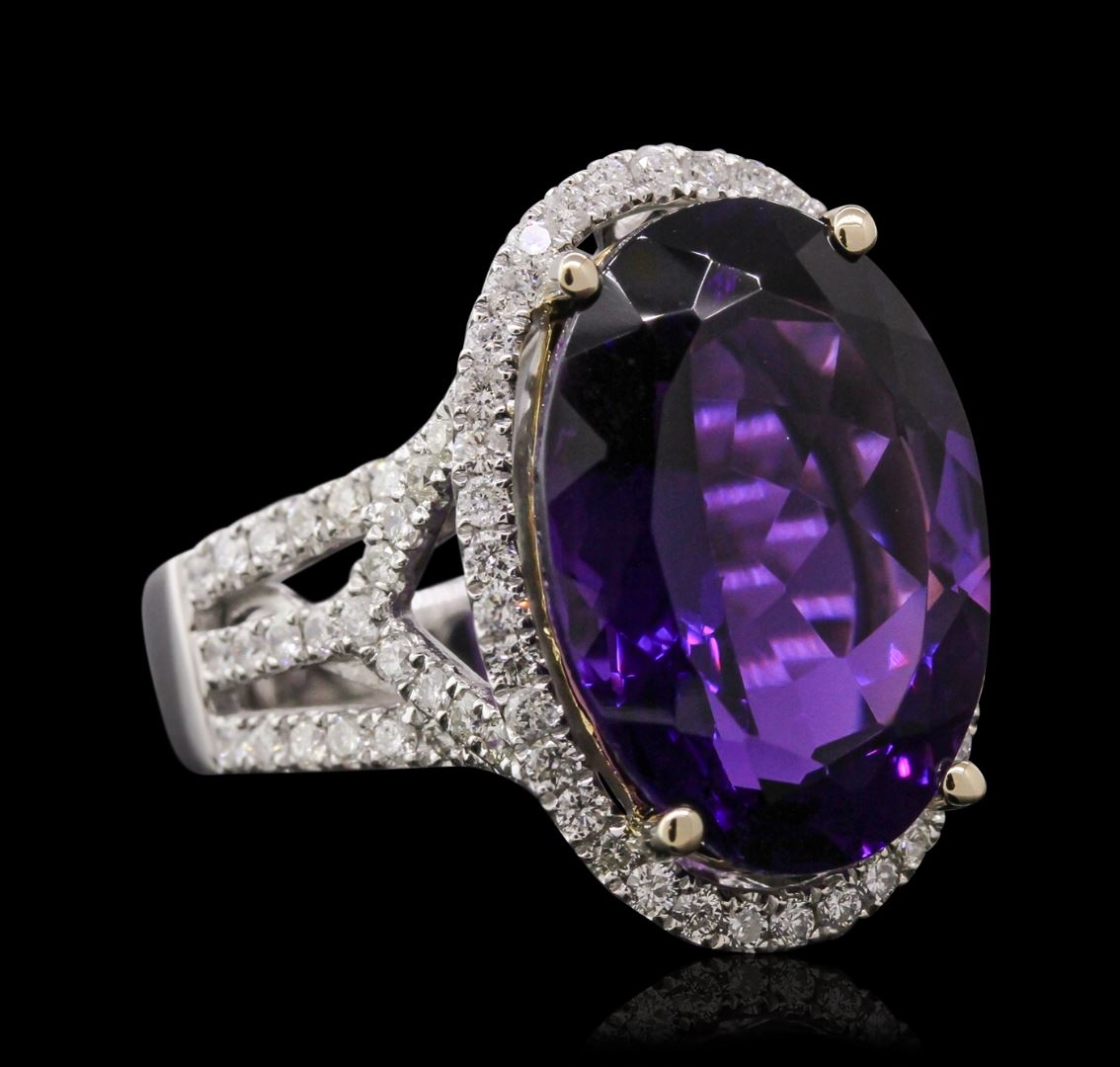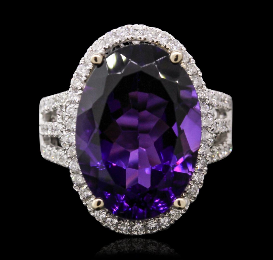 One electronically tested 14KT white gold ladies cast amethyst and diamond ring with a bright polish finish. Condition is new, good workmanship. The featured amethyst is set within a diamond bezel supported by diamond set split shoulders, completed by a three and one-half millimeter wide band. Identified with markings of "14K". Containing: One prong set oval mixed cut natural amethyst, measuring 18.00 x 12.90 x 8.50mm, 6%. bulge factor, approximate weight of 11.51ct., clarity is eye clean, type II, dark, moderately strong, reddish purple color, (GIA rP 7/4), cut is good. Transmitting light with no distortion, transparent. Colored Stone Grading Report attached. Graded in the setting. Eighty-Eight prong set round brilliant cut diamonds, measuring 1.60 - 1.40 x 0.90mm (depth est.) approximate. Total Weight of 88 Stones = 1.21ct. Graded in the setting. Clarity: SI-1 to I-1. Color: G - I. Total Weight of Colored Stones 11.51ct. Total Weight of Diamonds 1.21ct. Total Weight of Ring 9.32grams. AIG Appraised at $5,710.00.