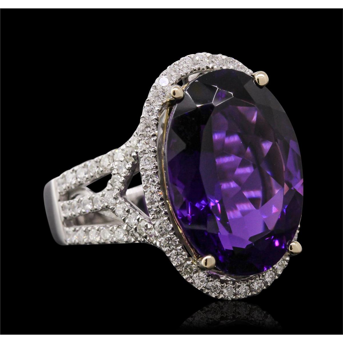One electronically tested 14KT white gold ladies cast amethyst and diamond ring with a bright polish finish. Condition is new, good workmanship. The featured amethyst is set within a diamond bezel supported by diamond set split shoulders, completed by a three and one-half millimeter wide band. Identified with markings of "14K". Containing: One prong set oval mixed cut natural amethyst, measuring 18.00 x 12.90 x 8.50mm, 6%. bulge factor, approximate weight of 11.51ct., clarity is eye clean, type II, dark, moderately strong, reddish purple color, (GIA rP 7/4), cut is good. Transmitting light with no distortion, transparent. Colored Stone Grading Report attached. Graded in the setting. Eighty-Eight prong set round brilliant cut diamonds, measuring 1.60 - 1.40 x 0.90mm (depth est.) approximate. Total Weight of 88 Stones = 1.21ct. Graded in the setting. Clarity: SI-1 to I-1. Color: G - I. Total Weight of Colored Stones 11.51ct. Total Weight of Diamonds 1.21ct. Total Weight of Ring 9.32grams. AIG Appraised at $5,710.00.