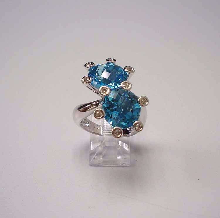 One 14KT White Gold 11.51ctw Blue Topaz and Diamond Ring. (2) Blue Topaz stones with a total weight of 11.51cts. (10) Diamonds with a total weight of 0.18cts. Total weight of this ring is 8.88 grams. Total weight of this ring is 8.88 grams.