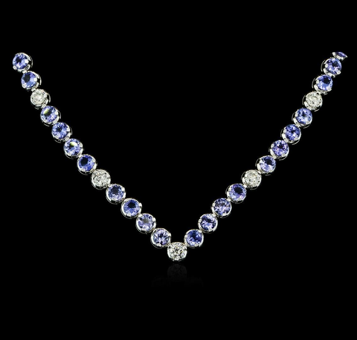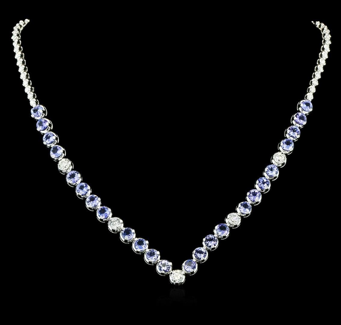 One electronically tested 14KT white gold ladies combination cast & assembled tanzanite and diamond necklace with a hidden box clasp with safety closer with a bright polish finish. Identified with markings of "14K". Condition is new. Containing: Twenty-four prong set round modified brilliant cut natural tanzanites, measuring 5.17 - 4.80 x 2.66 mm, approximate total weight of 11.52ct., clarity is eye clean, type I, medium light, very slightly grayish, violet color, (GIA V 4/3), cut is good. Five prong set round brilliant cut diamonds, measuring 4.79 - 4.30 x 2.95mm (depth est.) approximate total weight of 5 Stones = 1.86ct. Clarity: SI-2 to I-1. Color: I - J, Cut is Good. All diamonds and colored gemstones are graded in the mounting, unless otherwise stated. Colored gemstones are presumed to have been subjected to commonly used enhancement processes. Sixty-Six prong set round brilliant cut diamonds, measuring 2.00 - 2.00 x 1.20mm (depth est.) approximate total weight of 66 Stones = 1.93ct. Clarity: SI-2. Color: I - J, Cut is Good. All diamonds and colored gemstones are graded in the mounting, unless otherwise stated. Colored gemstones are presumed to have been subjected to commonly used enhancement processes. Total Weight of Colored Stones 11.52ct. Total Weight of Diamonds 3.79ct. Total Weight of Necklace 37.50 grams. GGL Appraised.
