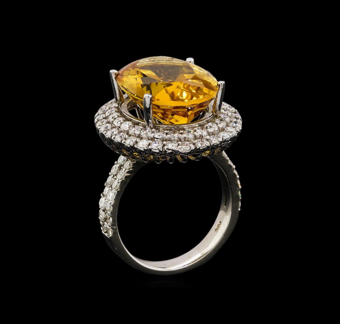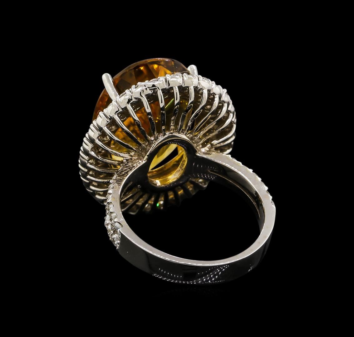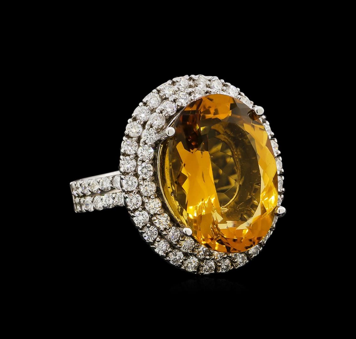 One electronically tested 14KT white gold ladies cast citrine and diamond ring with a bright polish finish. Identified with markings of "14K". Condition is new. Containing: One prong set oval modified brilliant cut natural citrine quartz, measuring 18.93 x 13.00 x 8.45mm, approximate weight of 11.62ct., clarity is eye clean, type I, medium light, brownish, orangy yellow color, (GIA oY 4/3), cut is good. Ninety-Five prong set round brilliant cut diamonds, measuring 1.50 - 1.50 x 0.90mm (depth est.) approximate total weight of 95 Stones = 1.17ct. Clarity: SI-2 to I-1. Color: I - J, Cut is Good. Colored gemstones are presumed to have been subjected to commonly used enhancement processes. All diamonds and colored gemstones are graded in the mounting, unless otherwise stated. Total Weight of Colored Stones 11.62ct. Total Weight of Diamonds 1.17ct. Total Weight of Ring 10.90 grams. GGL Appraised at $6,095.00.