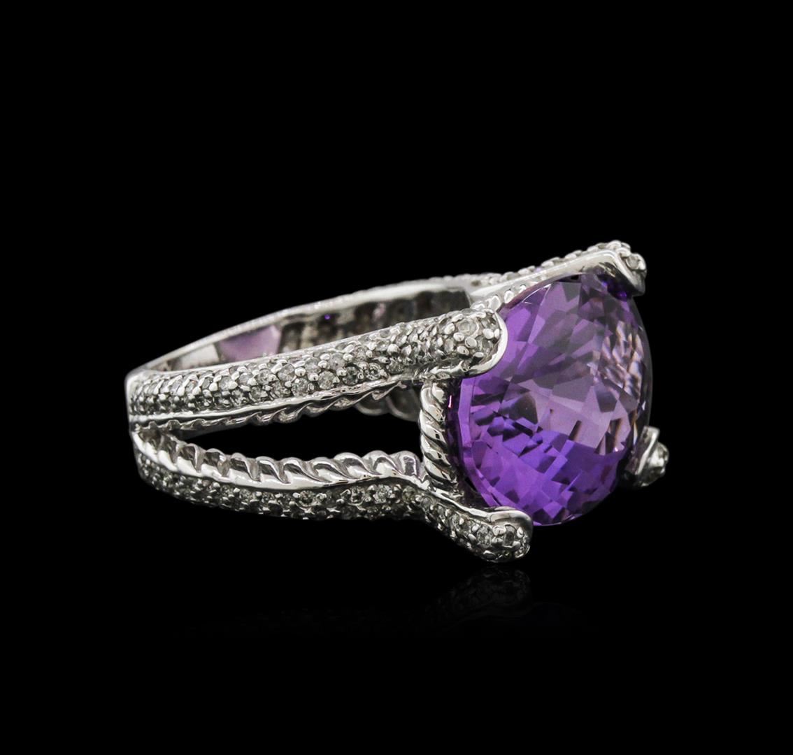 One electronically tested 14KT white gold ladies cast amethyst and diamond ring with a split shoulder shank with a bright polish finish. Trademark is EFFY. Identified with markings of "14K". Condition is new. Containing: One prong set oval modified mixed cut natural amethyst, measuring 17.94 x 12.94 x 9.03mm, approximate weight of 11.71ct., clarity is eye clean, type II, medium light, moderately strong, purple color, (GIA P 4/4), cut is good. Two Hundred Seventy-Two prong set round brilliant cut diamonds, measuring 1.00 - 1.00 x 0.60mm (depth est.) approximate total weight of 272 Stones = 0.98ct. Clarity of I-1 to I-2, Color of I - J. All diamonds and colored gemstones are graded in the mounting, unless otherwise stated. Colored gemstones are presumed to have been subjected to commonly used enhancement processes. Total Weight of Colored Stones 11.71ct. Total Weight of Diamonds 0.98ct. Total Weight of Ring 12.00 grams. GGL Appraised at $4,405.00.