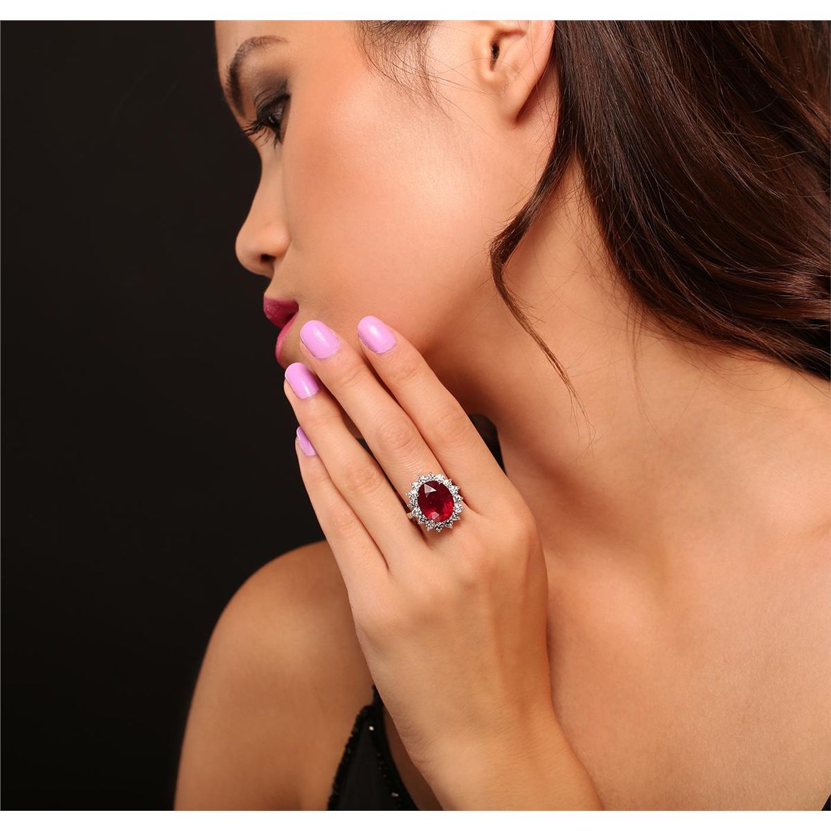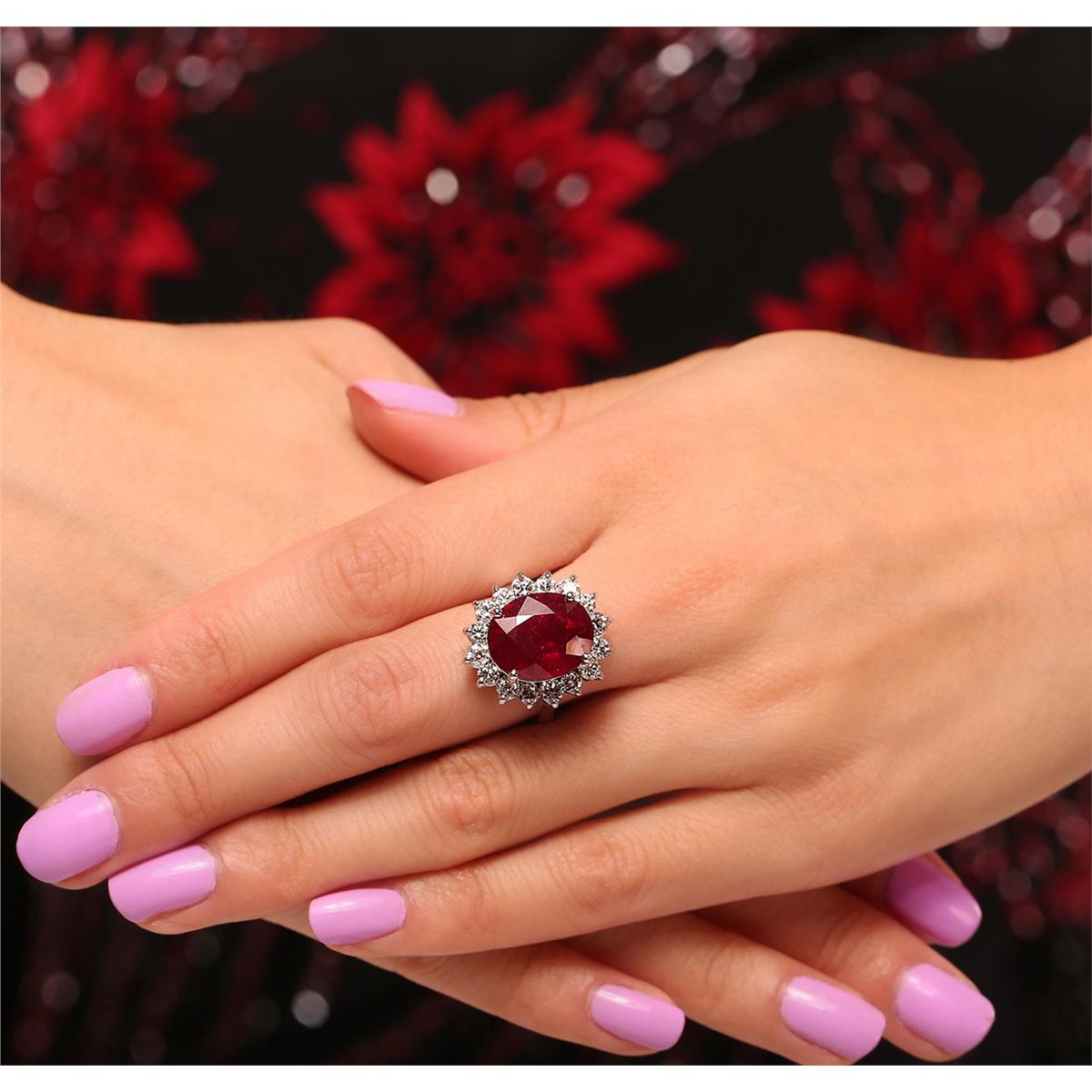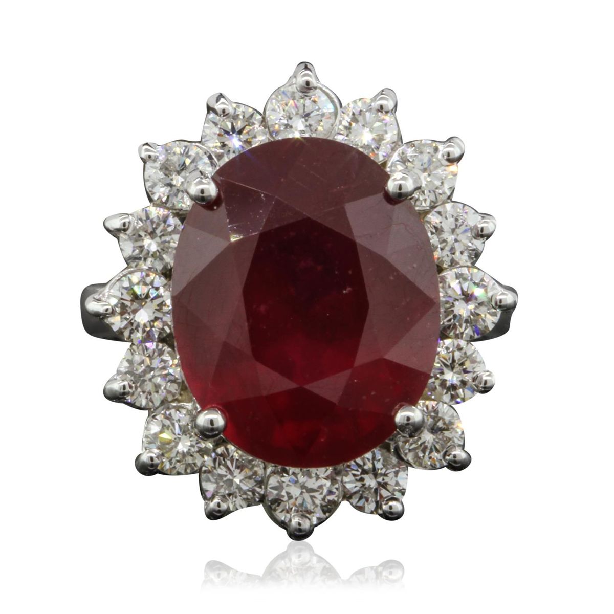 One electronically tested 14KT white gold ladies cast ruby & diamond ring with a bright polish finish. Condition is new, good workmanship. The featured ruby is set within a diamond set bezel completed by a three millimeter wide band. Identified with markings of "14K". Containing: One prong set oval mixed cut natural ruby, measuring 14.20 x 11.40 x 8.00mm, 12% bulge factor, approximate weight of 11.74ct. with a faint Red fluorescence, clarity is moderately included, type II, dark, strong, strongly purplish red color, (GIA stpR 7/5), cut is good. Transmitting light somewhat diffusely, transparent to translucent. Naturally occurring internal & external characteristics are present. Indications of laboratory high temperature heat treatment, with glass & flux additives. Colored Stone Grading Report attached. Graded in the setting. Ruby has a low tolerance to rhodium plating, repolishing the surface, & ultrasonic cleaning. Sixteen prong set round brilliant cut diamonds, measuring 3.00 - 2.80 x 1.77mm (depth est.) approximate. Total Weight of 16 Stones = 1.44ct. Graded in the setting. Clarity: SI-2 to I-1. Color: H - J. Total Weight of Colored Stones 11.74ct. Total Weight of Diamonds 1.44ct. Total Weight of Ring 8.45 grams. AIG Appraised at $8,480.00.