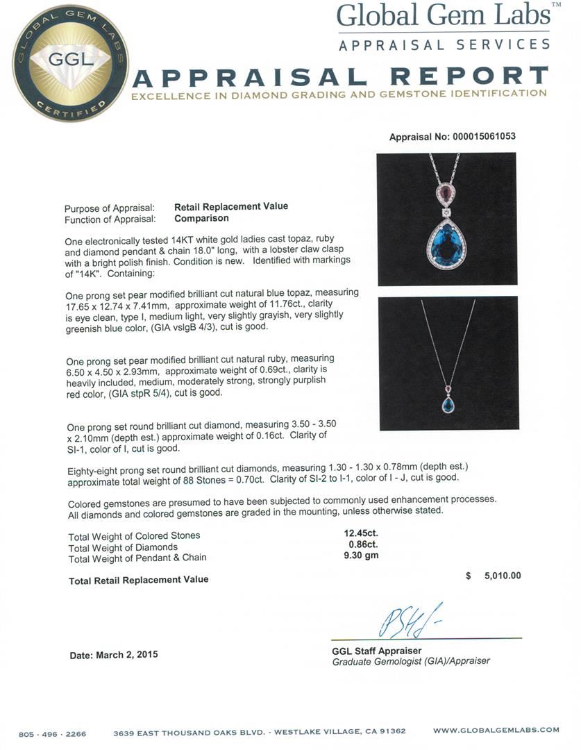 One electronically tested 14KT white gold ladies cast topaz, ruby and diamond pendant & chain 18.0" long, with a lobster claw clasp with a bright polish finish. Identified with markings of "14K". Condition is new. Containing: One prong set pear modified brilliant cut natural blue topaz, measuring 17.65 x 12.74 x 7.41mm, approximate weight of 11.76ct., clarity is eye clean, type I, medium light, very slightly grayish, very slightly greenish blue color, (GIA vslgB 4/3), cut is good. One prong set pear modified brilliant cut natural ruby, measuring 6.50 x 4.50 x 2.93mm, approximate weight of 0.69ct., clarity is heavily included, medium, moderately strong, strongly purplish red color, (GIA stpR 5/4), cut is good. One prong set round brilliant cut diamond, measuring 3.50 - 3.50 x 2.10mm (depth est.) approximate weight of 0.16ct. Clarity: SI-1. Color: I, Cut is Good. Eighty-Eight prong set round brilliant cut diamonds, measuring 1.30 - 1.30 x 0.78mm (depth est.) approximate total weight of 88 Stones = 0.70ct. Clarity: SI-2 to I-1. Color: I - J, Cut is Good. Colored gemstones are presumed to have been subjected to commonly used enhancement processes. All diamonds and colored gemstones are graded in the mounting, unless otherwise stated. Total Weight of Colored Stones 12.45ct. Total Weight of Diamonds 0.86ct. Total Weight of Pendant & Chain 9.30 grams. GGL Appraised at $5,010.00.
