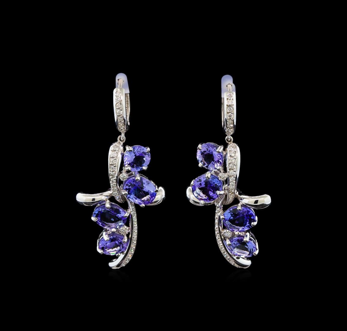 One pair electronically tested 14KT white gold ladies cast tanzanite and diamond earrings with hinged clip backs with a bright polish finish. Identified with markings of "14K". Condition is new. Containing: Four prong set round modified brilliant cut natural tanzanites, measuring 6.90 - 6.90 x 4.49 mm, approximate total weight of 5.16ct., clarity is eye clean, type I, medium light, very slightly grayish, violet color, (GIA V 4/3), cut is good. Sixty-Eight prong set round brilliant cut diamonds, measuring 2.00. - 1.30 x 0.99mm (depth est.) approximate total weight of 68 Stones = 0.78ct. Clarity: SI-1 to SI-2. Color: I - J, Cut is Good. Four prong set oval modified brilliant cut natural tanzanites, measuring 8.90 x 6.80 x 4.42mm, approximate total weight of 6.65ct., clarity is eye clean, type I, medium light, very slightly grayish, violet color, (GIA V 4/3), cut is good. Colored gemstones are presumed to have been subjected to commonly used enhancement processes. All diamonds and colored gemstones are graded in the mounting, unless otherwise stated. Total Weight of Colored Stones 11.81ct. Total Weight of Diamonds 0.78ct. Total Weight of Earrings 14.00. grams. GGL Appraised at $6,595.00.