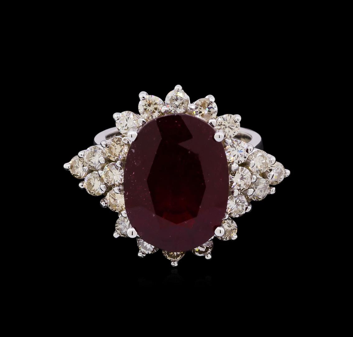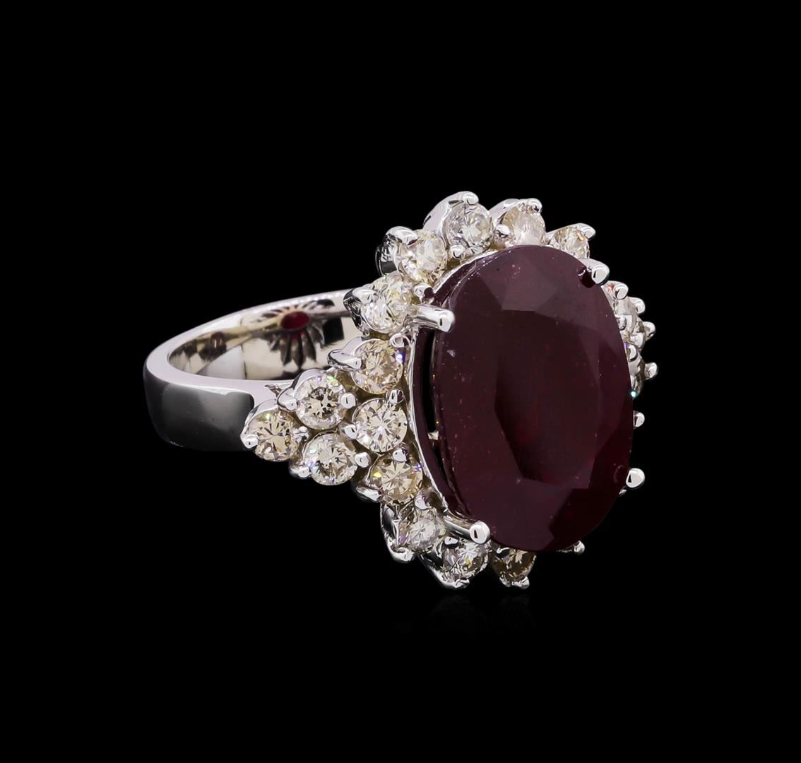 One electronically tested 14KT white gold ladies cast ruby and diamond ring with a bright polish finish. The featured ruby is set within a diamond set bezel supported by diamond set shoulders, completed by a four millimeter wide band. Identified with markings of "K14". Condition is new, good workmanship. Containing: One prong set oval mixed cut natural ruby, measuring 16.00 x 11.95 x 6.85mm, 10%. bulge factor, approximate weight of 11.87ct., clarity is heavily included, type II, dark, very slightly brownish, red color, (GIA R 7/3), cut is good. Transmitting light somewhat diffusely, transparent to translucent. Naturally occurring internal & external characteristics are present. Indications of laboratory high temperature heat treatment, with glass & flux additives. Colored Stone Grading Report attached. Graded in the setting. Ruby has a low tolerance to rhodium plating, repolishing the surface, & ultrasonic cleaning. Twenty-Two prong set round brilliant cut diamonds, measuring 2.80 - 2.70 x 1.65mm (depth est.) approximate. Total Weight of 22 Stones = 1.77ct. Graded in the setting. Clarity: SI-1 to I-1 . Total Weight of Colored Stones 11.87ct. Total Weight of Diamonds 1.77ct. AIG Appraised at $8,790.00.