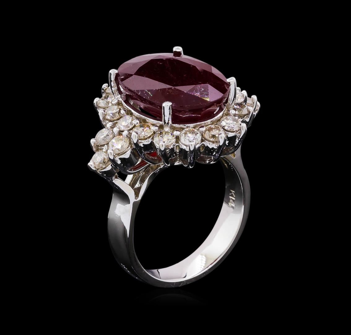 One electronically tested 14KT white gold ladies cast ruby and diamond ring with a bright polish finish. The featured ruby is set within a diamond set bezel supported by diamond set shoulders, completed by a four millimeter wide band. Identified with markings of "K14". Condition is new, good workmanship. Containing: One prong set oval mixed cut natural ruby, measuring 16.00 x 11.95 x 6.85mm, 10%. bulge factor, approximate weight of 11.87ct., clarity is heavily included, type II, dark, very slightly brownish, red color, (GIA R 7/3), cut is good. Transmitting light somewhat diffusely, transparent to translucent. Naturally occurring internal & external characteristics are present. Indications of laboratory high temperature heat treatment, with glass & flux additives. Colored Stone Grading Report attached. Graded in the setting. Ruby has a low tolerance to rhodium plating, repolishing the surface, & ultrasonic cleaning. Twenty-Two prong set round brilliant cut diamonds, measuring 2.80 - 2.70 x 1.65mm (depth est.) approximate. Total Weight of 22 Stones = 1.77ct. Graded in the setting. Clarity: SI-1 to I-1 . Total Weight of Colored Stones 11.87ct. Total Weight of Diamonds 1.77ct. AIG Appraised at $8,790.00.