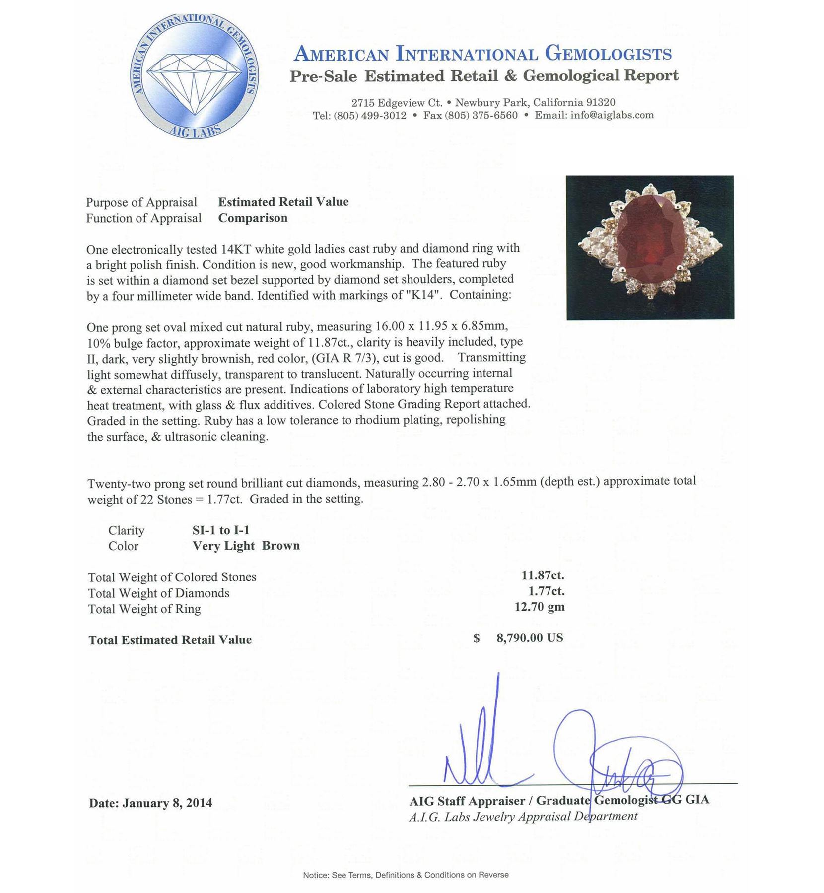 One electronically tested 14KT white gold ladies cast ruby and diamond ring with a bright polish finish. The featured ruby is set within a diamond set bezel supported by diamond set shoulders, completed by a four millimeter wide band. Identified with markings of "K14". Condition is new, good workmanship. Containing: One prong set oval mixed cut natural ruby, measuring 16.00 x 11.95 x 6.85mm, 10%. bulge factor, approximate weight of 11.87ct., clarity is heavily included, type II, dark, very slightly brownish, red color, (GIA R 7/3), cut is good. Transmitting light somewhat diffusely, transparent to translucent. Naturally occurring internal & external characteristics are present. Indications of laboratory high temperature heat treatment, with glass & flux additives. Colored Stone Grading Report attached. Graded in the setting. Ruby has a low tolerance to rhodium plating, repolishing the surface, & ultrasonic cleaning. Twenty-Two prong set round brilliant cut diamonds, measuring 2.80 - 2.70 x 1.65mm (depth est.) approximate. Total Weight of 22 Stones = 1.77ct. Graded in the setting. Clarity: SI-1 to I-1 . Total Weight of Colored Stones 11.87ct. Total Weight of Diamonds 1.77ct. AIG Appraised at $8,790.00.