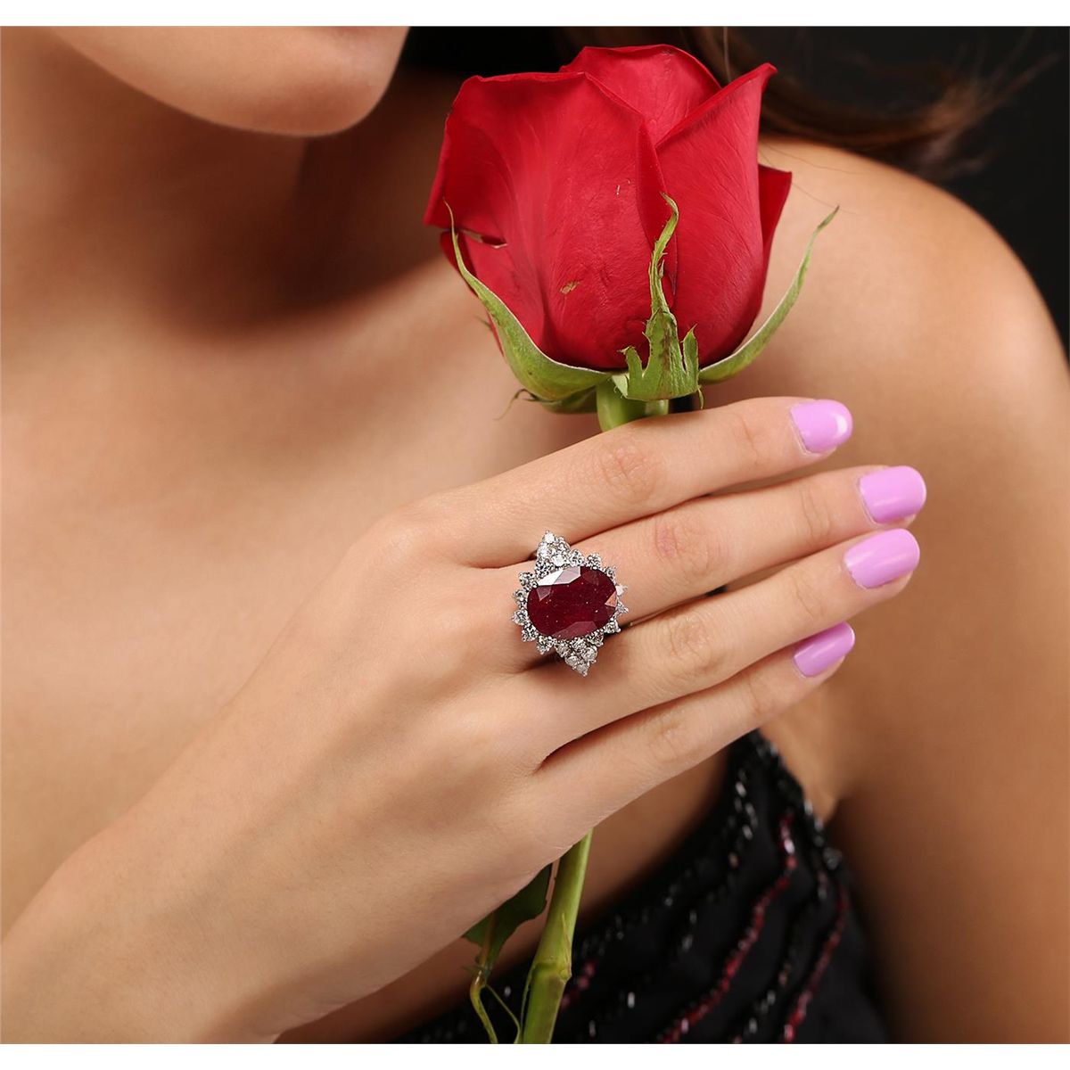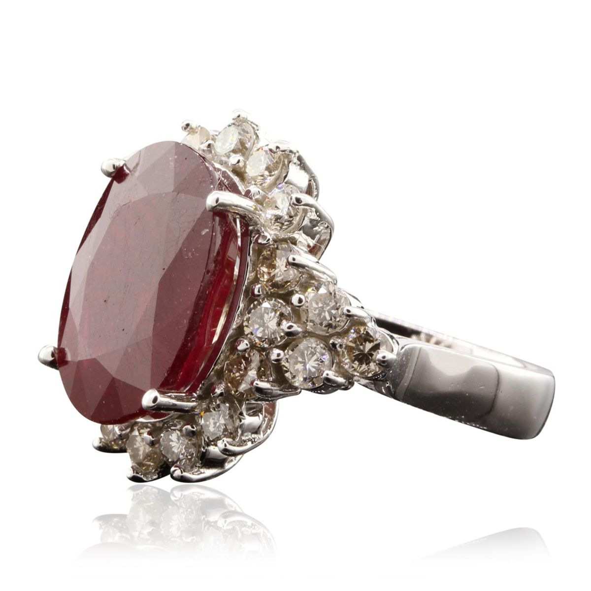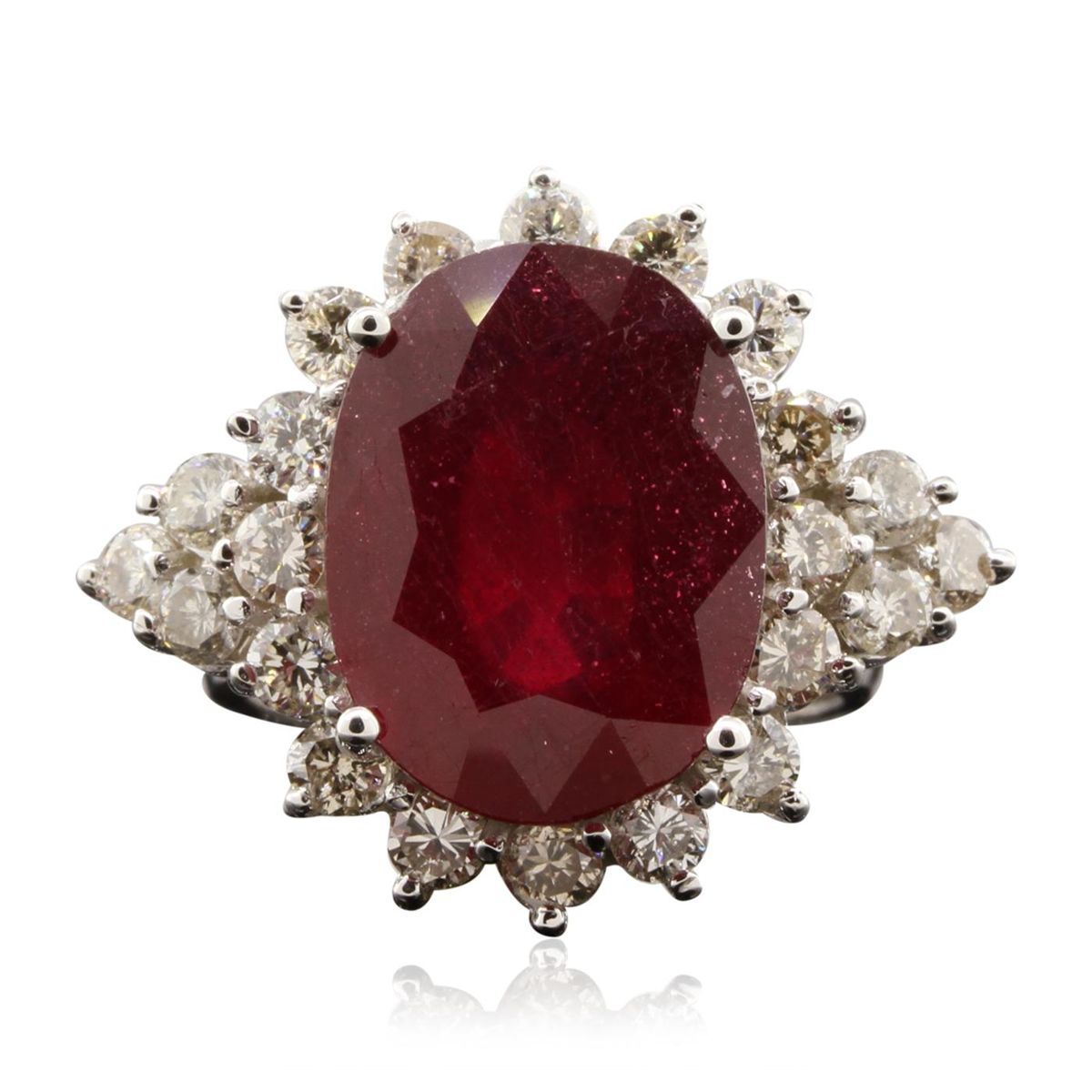 One electronically tested 14KT white gold ladies cast ruby and diamond ring with a bright polish finish. The featured ruby is set within a diamond set bezel supported by diamond set shoulders, completed by a four millimeter wide band. Identified with markings of "K14". Condition is new, good workmanship. Containing: One prong set oval mixed cut natural ruby, measuring 16.00 x 11.95 x 6.85mm, 10%. bulge factor, approximate weight of 11.87ct., clarity is heavily included, type II, dark, very slightly brownish, red color, (GIA R 7/3), cut is good. Transmitting light somewhat diffusely, transparent to translucent. Naturally occurring internal & external characteristics are present. Indications of laboratory high temperature heat treatment, with glass & flux additives. Colored Stone Grading Report attached. Graded in the setting. Ruby has a low tolerance to rhodium plating, repolishing the surface, & ultrasonic cleaning. Twenty-Two prong set round brilliant cut diamonds, measuring 2.80 - 2.70 x 1.65mm (depth est.) approximate. Total Weight of 22 Stones = 1.77ct. Graded in the setting. Clarity: SI-1 to I-1 . Total Weight of Colored Stones 11.87ct. Total Weight of Diamonds 1.77ct. AIG Appraised at $8,790.00.