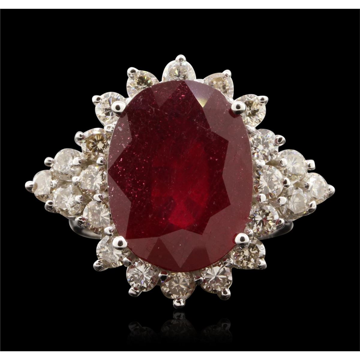One electronically tested 14KT white gold ladies cast ruby and diamond ring with a bright polish finish. The featured ruby is set within a diamond set bezel supported by diamond set shoulders, completed by a four millimeter wide band. Identified with markings of "K14". Condition is new, good workmanship. Containing: One prong set oval mixed cut natural ruby, measuring 16.00 x 11.95 x 6.85mm, 10%. bulge factor, approximate weight of 11.87ct., clarity is heavily included, type II, dark, very slightly brownish, red color, (GIA R 7/3), cut is good. Transmitting light somewhat diffusely, transparent to translucent. Naturally occurring internal & external characteristics are present. Indications of laboratory high temperature heat treatment, with glass & flux additives. Colored Stone Grading Report attached. Graded in the setting. Ruby has a low tolerance to rhodium plating, repolishing the surface, & ultrasonic cleaning. Twenty-Two prong set round brilliant cut diamonds, measuring 2.80 - 2.70 x 1.65mm (depth est.) approximate. Total Weight of 22 Stones = 1.77ct. Graded in the setting. Clarity: SI-1 to I-1 . Total Weight of Colored Stones 11.87ct. Total Weight of Diamonds 1.77ct. AIG Appraised at $8,790.00.