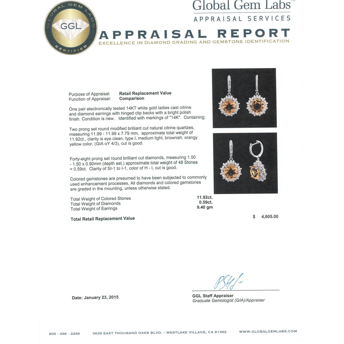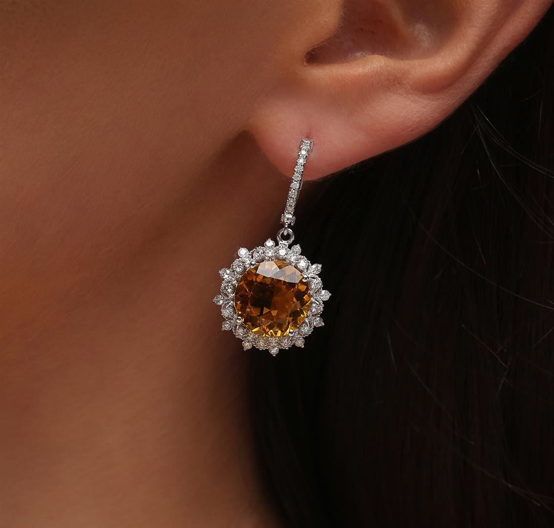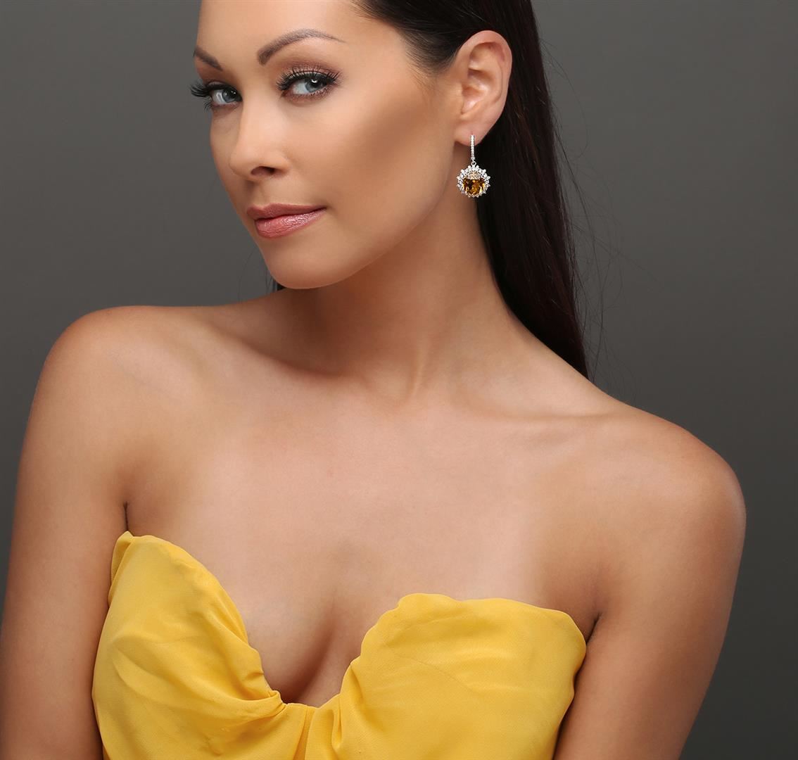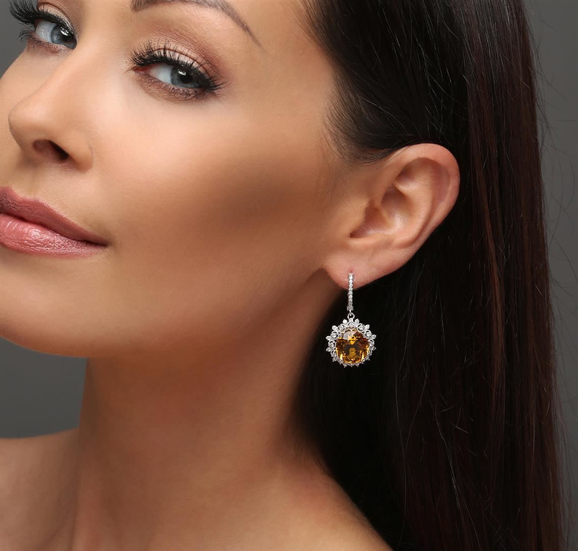 One pair electronically tested 14KT white gold ladies cast citrine and diamond earrings with hinged clip backs with a bright polish finish. Identified with markings of "14K". Condition is new. Containing: Two prong set round modified brilliant cut natural citrine quartzs, measuring 11.99 - 11.99 x 7.79 mm, approximate total weight of 11.92ct., clarity is eye clean, type I, medium light, brownish, orangy yellow color, (GIA oY 4/3), cut is good. Forty-Eight prong set round brilliant cut diamonds, measuring 1.50 - 1.50 x 0.90mm (depth est.) approximate total weight of 48 Stones = 0.59ct. Clarity: SI-1 to I-1. Color: H - I, Cut is Good. Colored gemstones are presumed to have been subjected to commonly used enhancement processes, All diamonds and colored gemstones are graded in the mounting, unless otherwise stated. Total Weight of Colored Stones 11.92ct. Total Weight of Diamonds 0.59ct. Total Weight of Earrings 9.40 grams. GGL Appraised at $4,605.00.