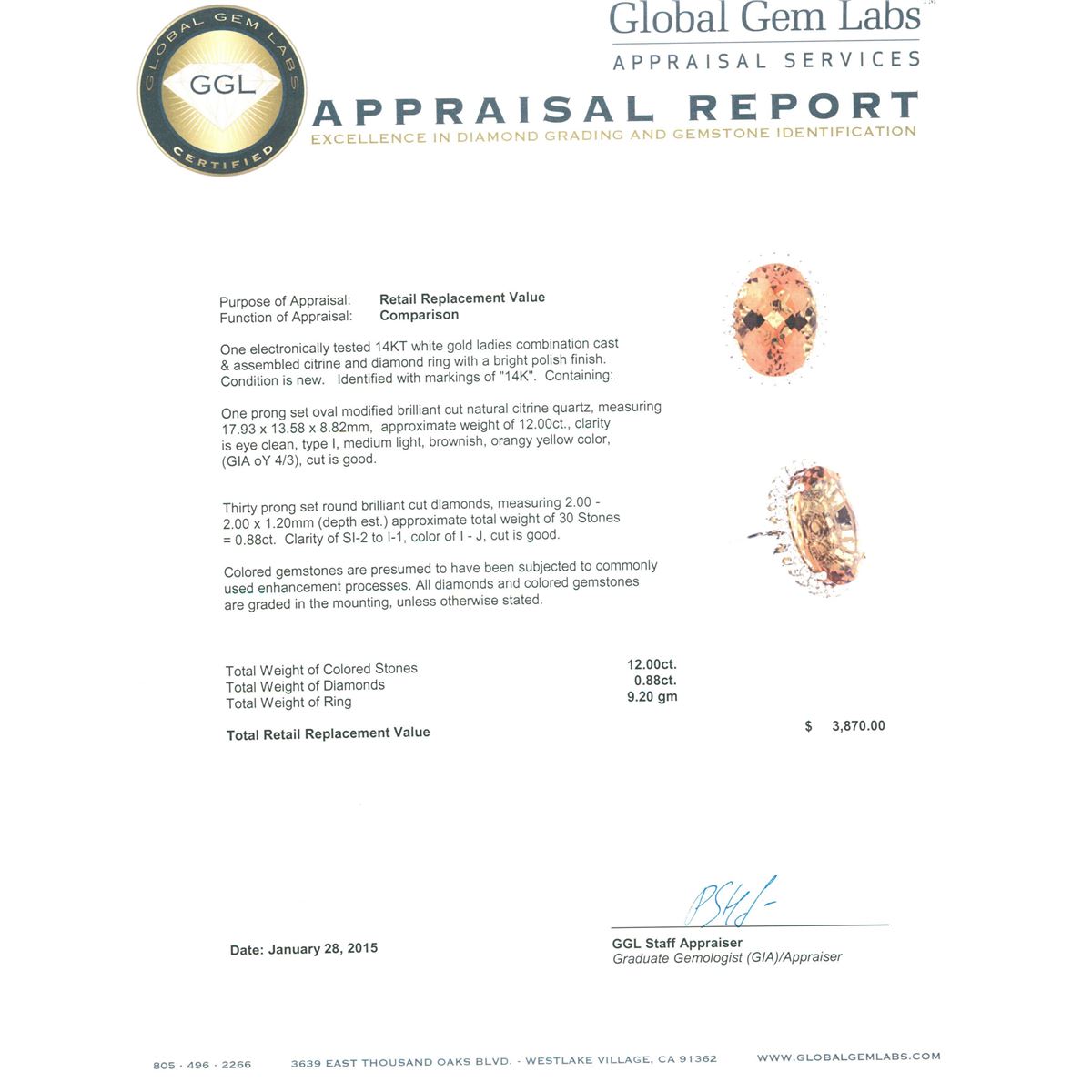 One electronically tested 14KT white gold ladies combination cast & assembled citrine and diamond ring with a bright polish finish. Identified with markings of "14K". Condition is new. Containing: One prong set oval modified brilliant cut natural citrine quartz, measuring 17.93 x 13.58 x 8.82mm, approximate weight of 12.00ct., clarity is eye clean, type I, medium light, brownish, orangy yellow color, (GIA oY 4/3), cut is good. Thirty prong set round brilliant cut diamonds, measuring 2.00 - 2.00 x 1.20mm (depth est.) approximate total weight of 30 Stones = 0.88ct. Clarity: SI-2 to I-1. Color: I - J, Cut is Good. Colored gemstones are presumed to have been subjected to commonly used enhancement processes. All diamonds and colored gemstones are graded in the mounting, unless otherwise stated. Total Weight of Colored Stones 12.00ct. Total Weight of Diamonds 0.88ct. Total Weight of Ring 9.20 grams. GGL Appraised at $3,870.00.