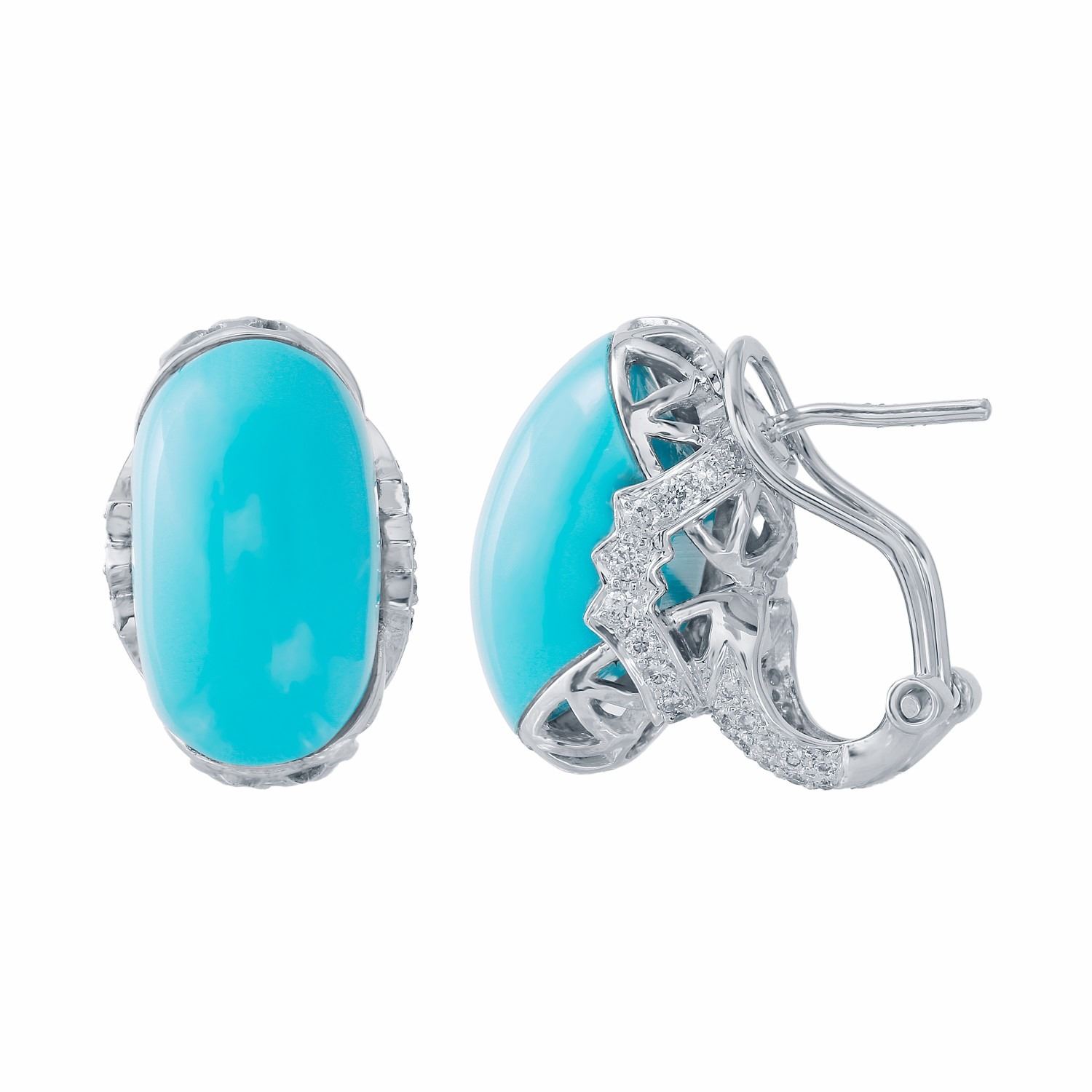 One 14KT White Gold 12.00ctw Turquoise and Diamond Earrings. (2) Turquoise stones with a total weight of 12.00cts. (100) Diamonds with a total weight of 0.68cts. Total weight of these earrings are 5.96 grams.