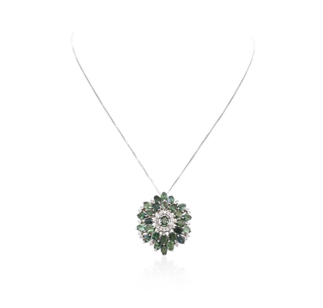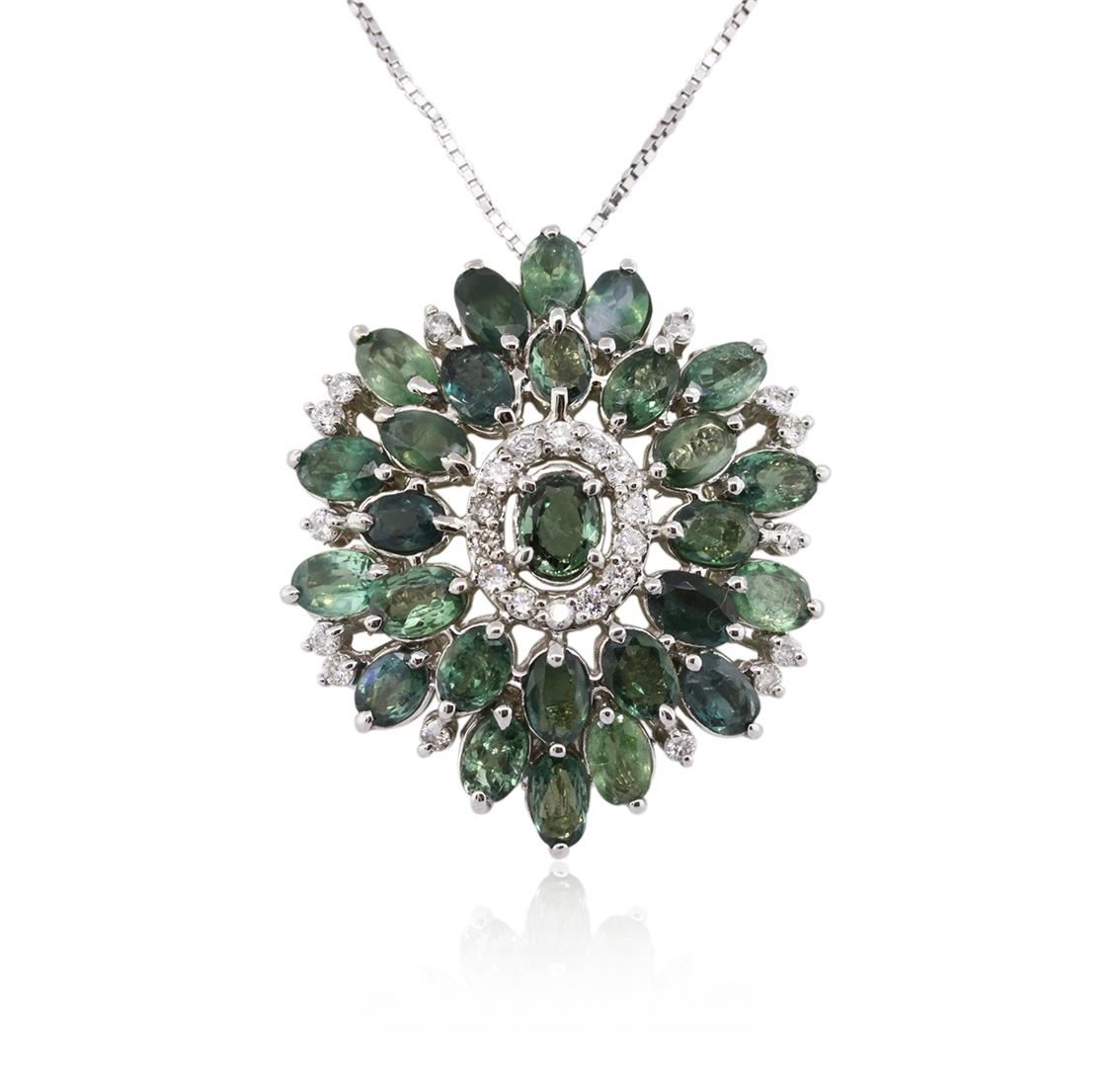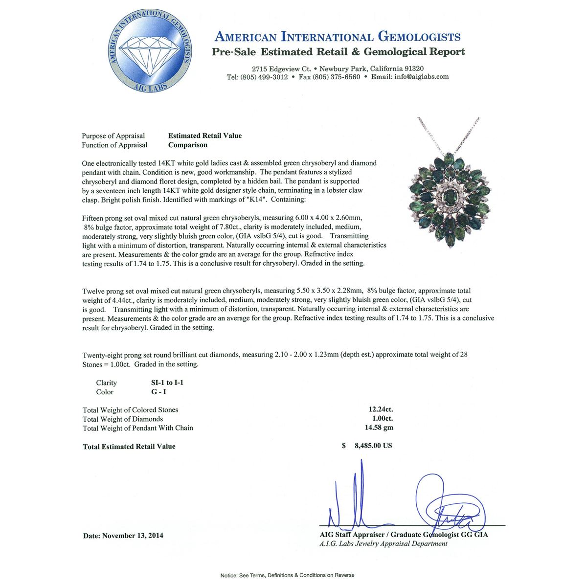 One electronically tested 14KT white gold ladies cast & assembled green chrysoberyl and diamond pendant with chain. The pendant features a stylized chrysoberyl and diamond floret design, completed by a hidden bail. The pendant is supported by a seventeen inch length 14KT white gold designer style chain, terminating in a lobster claw clasp. Bright polish finish. Identified with markings of "K14". Condition is new, good workmanship. Containing: Fifteen prong set oval mixed cut natural green chrysoberyls, measuring 6.00 x 4.00 x 2.60mm, 8% bulge factor, approximate total weight of 7.80ct., clarity is moderately included, medium, moderately strong, very slightly bluish green color, (GIA vslbG 5/4), cut is good. Transmitting light with a minimum of distortion, transparent. Naturally occurring internal & external characteristics are present. Measurements & the color grade are an average for the group. Refractive index testing results of 1.74 to 1.75. This is a conclusive result for chrysoberyl. Graded in the setting. Twelve prong set oval mixed cut natural green chrysoberyls, measuring 5.50 x 3.50 x 2.28mm, 8% bulge factor, approximate total weight of 4.44ct., clarity is moderately included, medium, moderately strong, very slightly bluish green color, (GIA vslbG 5/4), cut is good. Transmitting light with a minimum of distortion, transparent. Naturally occurring internal & external characteristics are present. Measurements & the color grade are an average for the group. Refractive index testing results of 1.74 to 1.75. This is a conclusive result for chrysoberyl. Graded in the setting. Twenty-Eight prong set round brilliant cut diamonds, measuring 2.10 - 2.00 x 1.23mm (depth est.) approximate total weight of 28 Stones = 1.00ct. Graded in the setting. Clarity: SI-1 to I-1. Color: G - I. Total Weight of Colored Stones 12.24ct. Total Weight of Diamonds 1.00ct. Total Weight of Pendant With Chain 14.58 grams. AIG Appraised at $8,485.00.