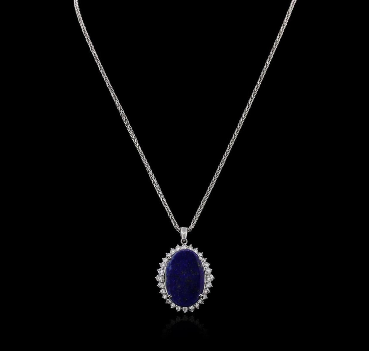 One electronically tested 14KT white gold ladies cast lapis lazuli and diamond pendant & chain 20.0" long, with a lobster claw clasp with a bright polish finish. Identified with markings of "14K". Condition is new. Containing: One prong set oval cut natural lapis lazuli, measuring 28.00 x 19.00 x 4.00mm, approximate weight of 12.29ct., clarity is severely included, medium dark, moderately strong, violetish blue color, (GIA vB 6/4), cut is good. Twenty-Eight prong set round brilliant cut diamonds, measuring 3.50 - 2.50 x 1.80mm (depth est.) approximate total weight of 28 Stones = 2.20ct. Clarity: VS-2 to SI-1. Color: H - I, Cut is Good. Diamonds and colored gemstones are graded in the mounting, unless otherwise stated. Colored gemstones are presumed to have been subjected to commonly used enhancement processes. Total Weight of Colored Stones 12.29ct. Total Weight of Diamonds 2.20ct. Total Weight of Pendant & Chain 19.10 grams. GGL Appraised.