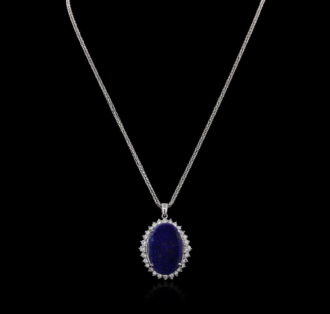 One electronically tested 14KT white gold ladies cast lapis lazuli and diamond pendant & chain 20.0" long, with a lobster claw clasp with a bright polish finish. Identified with markings of "14K". Condition is new. Containing: One prong set oval cut natural lapis lazuli, measuring 28.00 x 19.00 x 4.00mm, approximate weight of 12.29ct., clarity is severely included, medium dark, moderately strong, violetish blue color, (GIA vB 6/4), cut is good. Twenty-Eight prong set round brilliant cut diamonds, measuring 3.50 - 2.50 x 1.80mm (depth est.) approximate total weight of 28 Stones = 2.20ct. Clarity: VS-2 to SI-1. Color: H - I, Cut is Good. Diamonds and colored gemstones are graded in the mounting, unless otherwise stated. Colored gemstones are presumed to have been subjected to commonly used enhancement processes. Total Weight of Colored Stones 12.29ct. Total Weight of Diamonds 2.20ct. Total Weight of Pendant & Chain 19.10 grams. GGL Appraised.
