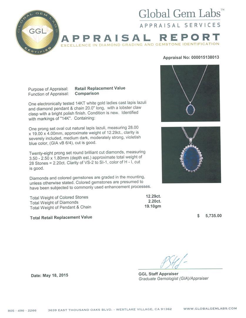 One electronically tested 14KT white gold ladies cast lapis lazuli and diamond pendant & chain 20.0" long, with a lobster claw clasp with a bright polish finish. Identified with markings of "14K". Condition is new. Containing: One prong set oval cut natural lapis lazuli, measuring 28.00 x 19.00 x 4.00mm, approximate weight of 12.29ct., clarity is severely included, medium dark, moderately strong, violetish blue color, (GIA vB 6/4), cut is good. Twenty-Eight prong set round brilliant cut diamonds, measuring 3.50 - 2.50 x 1.80mm (depth est.) approximate total weight of 28 Stones = 2.20ct. Clarity: VS-2 to SI-1. Color: H - I, Cut is Good. Diamonds and colored gemstones are graded in the mounting, unless otherwise stated. Colored gemstones are presumed to have been subjected to commonly used enhancement processes. Total Weight of Colored Stones 12.29ct. Total Weight of Diamonds 2.20ct. Total Weight of Pendant & Chain 19.10 grams. GGL Appraised at $5,735.00.