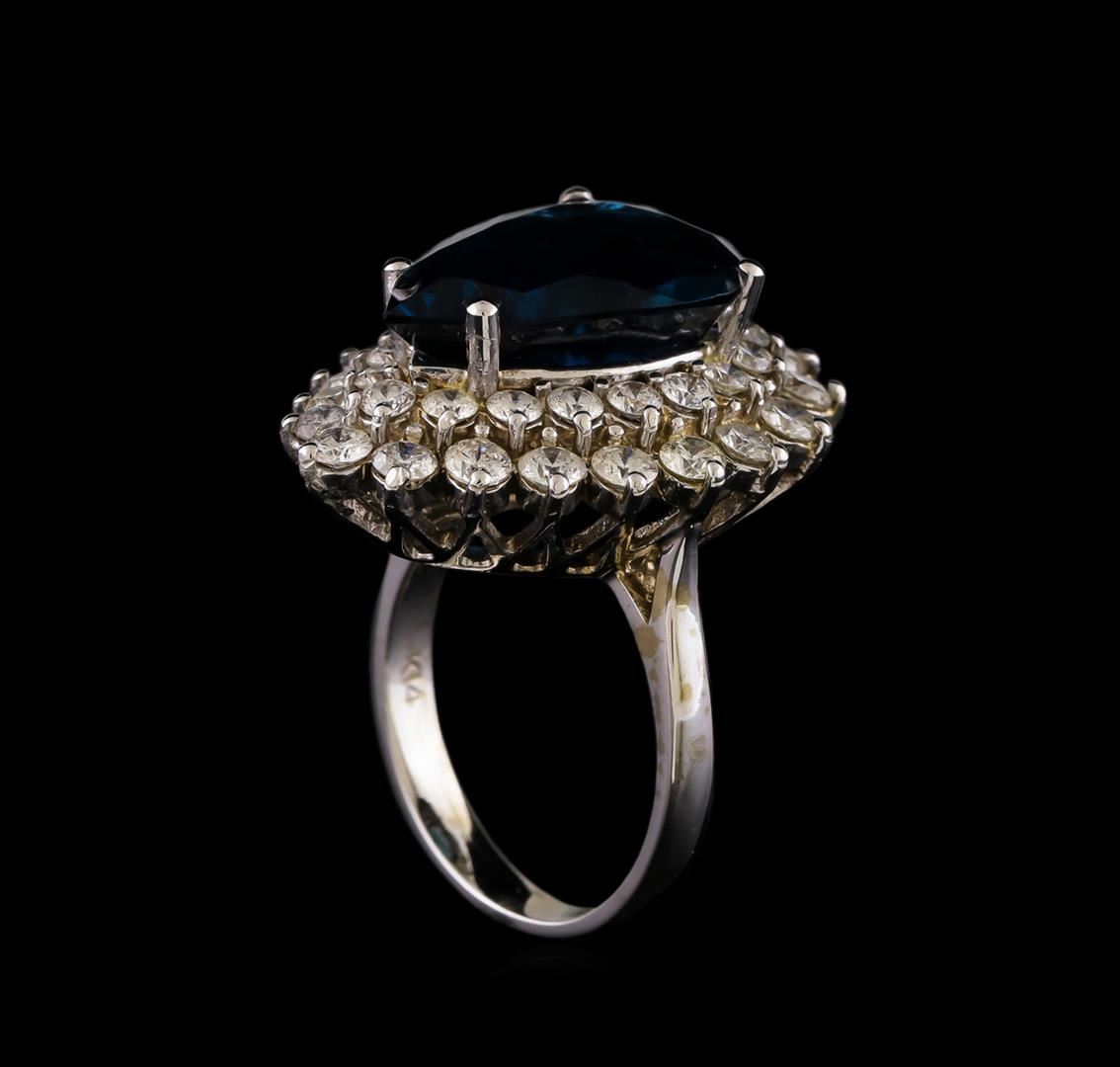 One electronically tested 14KT white gold ladies combination cast & assembled topaz and diamond ring with a bright polish finish. Identified with markings of "K14". Condition is new. Containing: One prong set pear modified brilliant cut natural blue topaz, measuring 17.34 x 12.49 x 8.12mm, approximate weight of 12.42ct., clarity is eye clean, type I, medium, very slightly grayish, very slightly greenish blue color, (GIA vslgB 5/3), cut is good. Eighteen prong set round brilliant cut diamonds, measuring 2.20 - 2.20 x 1.32mm (depth est.) approximate total weight of 18 Stones = 0.70ct. Clarity: SI-1 to SI-2. Color: H - I, Cut is Good. Nineteen prong set round brilliant cut diamonds, measuring 3.00 - 3.00 x 1.80mm (depth est.) approximate total weight of 19 Stones = 1.88ct. Clarity: SI-2 to I-1. Color: J, Cut is Good. Colored gemstones are presumed to have been subjected to commonly used enhancement processes. All diamonds and colored gemstones are graded in the mounting, unless otherwise stated. Total Weight of Colored Stones 12.42ct. Total Weight of Diamonds 2.58ct. Total Weight of Ring 11.60 grams. GGL Appraised at $7,325.00.
