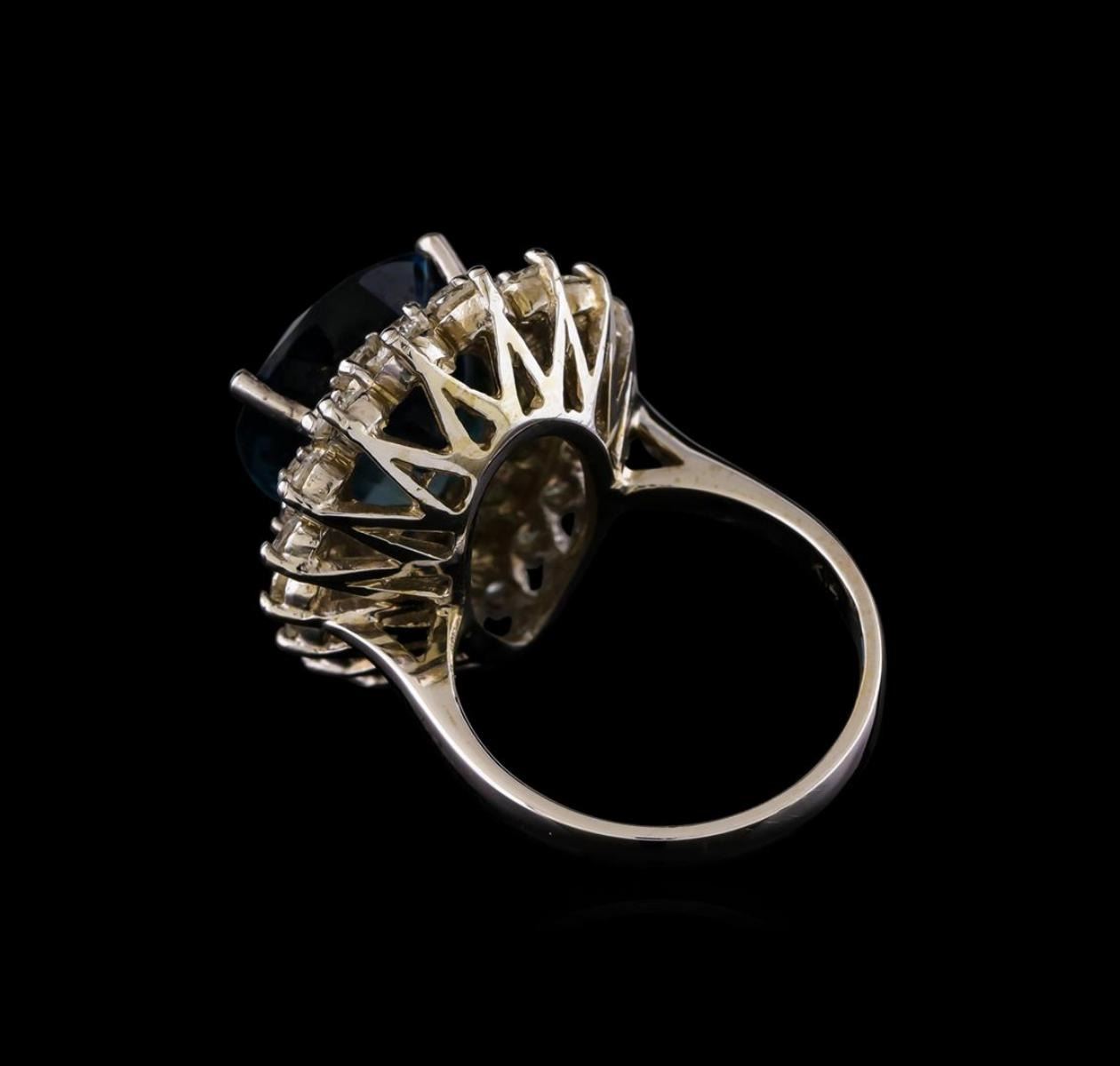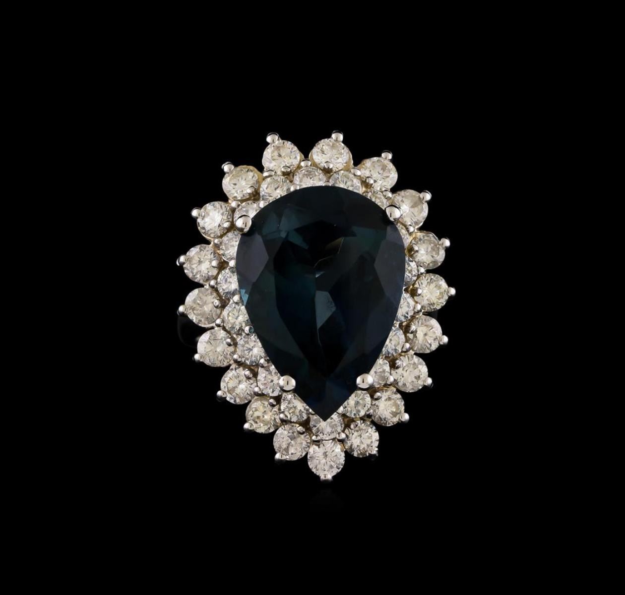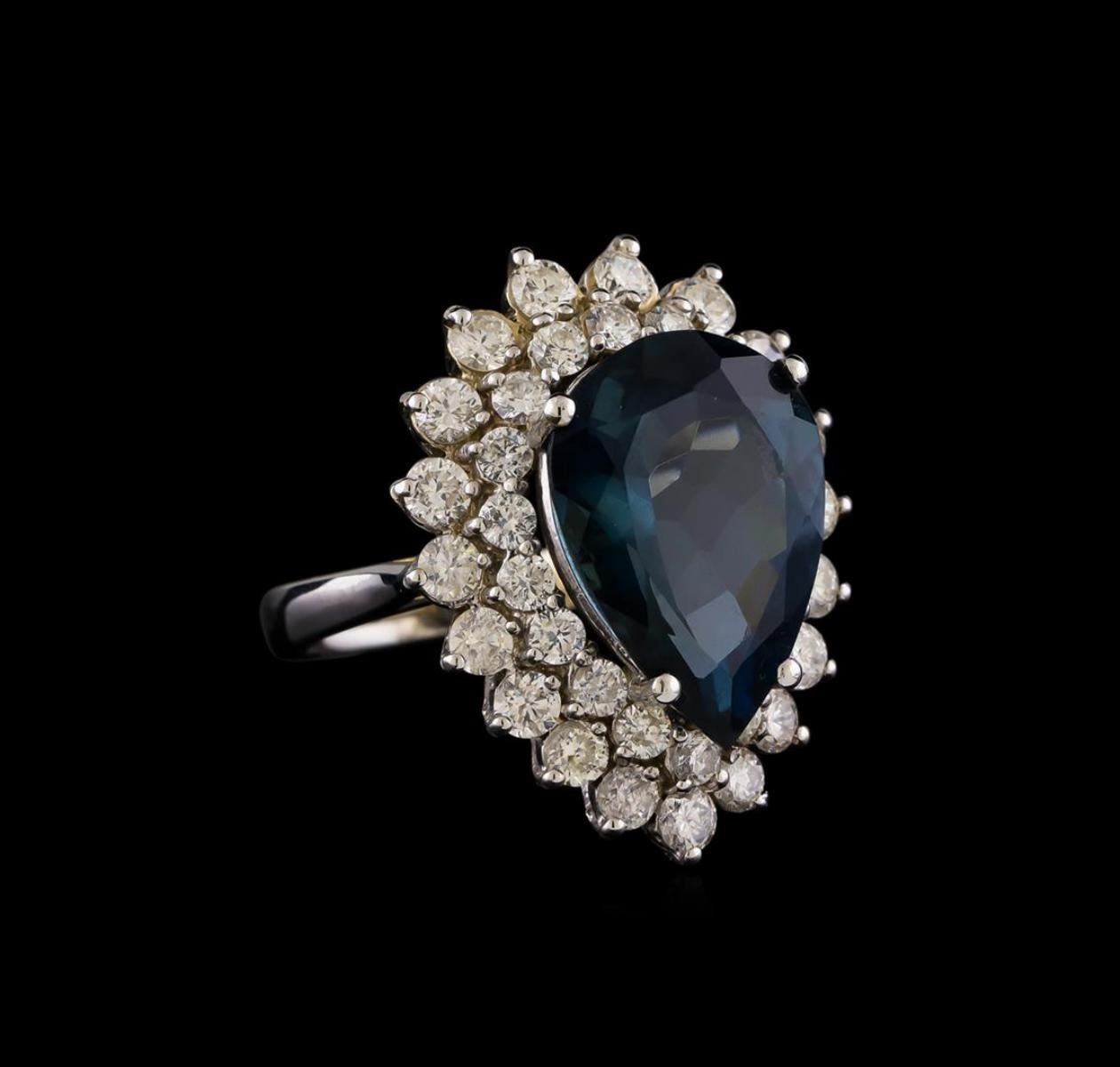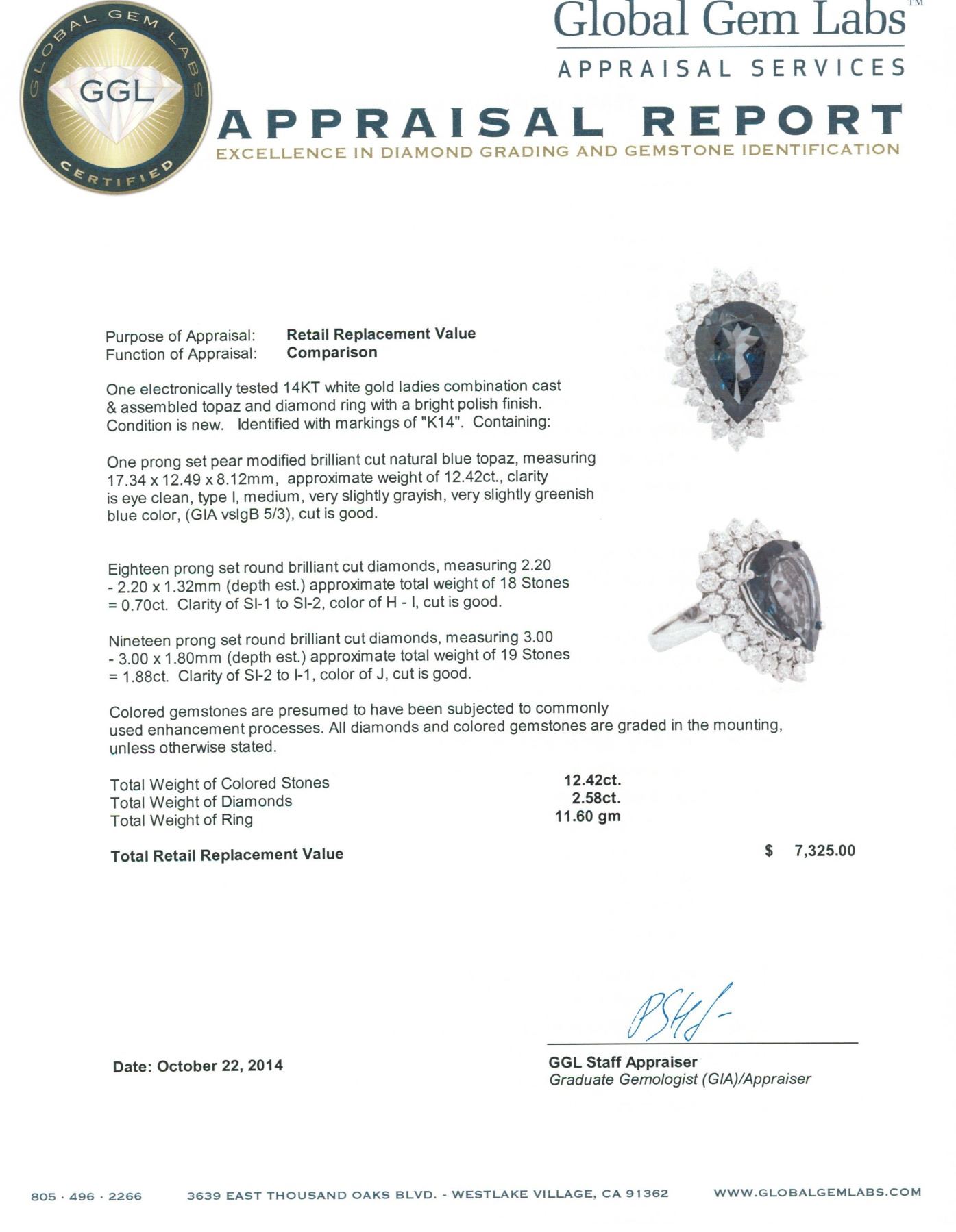 One electronically tested 14KT white gold ladies combination cast & assembled topaz and diamond ring with a bright polish finish. Identified with markings of "K14". Condition is new. Containing: One prong set pear modified brilliant cut natural blue topaz, measuring 17.34 x 12.49 x 8.12mm, approximate weight of 12.42ct., clarity is eye clean, type I, medium, very slightly grayish, very slightly greenish blue color, (GIA vslgB 5/3), cut is good. Eighteen prong set round brilliant cut diamonds, measuring 2.20 - 2.20 x 1.32mm (depth est.) approximate total weight of 18 Stones = 0.70 ct. Clarity: SI-1 to SI-2. Color: H - I, Cut is Good. Nineteen prong set round brilliant cut diamonds, measuring 3.00 - 3.00 x 1.80mm (depth est.) approximate total weight of 19 Stones = 1.88ct. Clarity: SI-2 to I-1. Color: J, Cut is Good. Colored gemstones are presumed to have been subjected to commonly used enhancement processes. All diamonds and colored gemstones are graded in the mounting, unless otherwise stated. Total Weight of Colored Stones 12.42ct. Total Weight of Diamonds 2.58ct. Total Weight of Ring 11.60 grams. GGL Appraised.