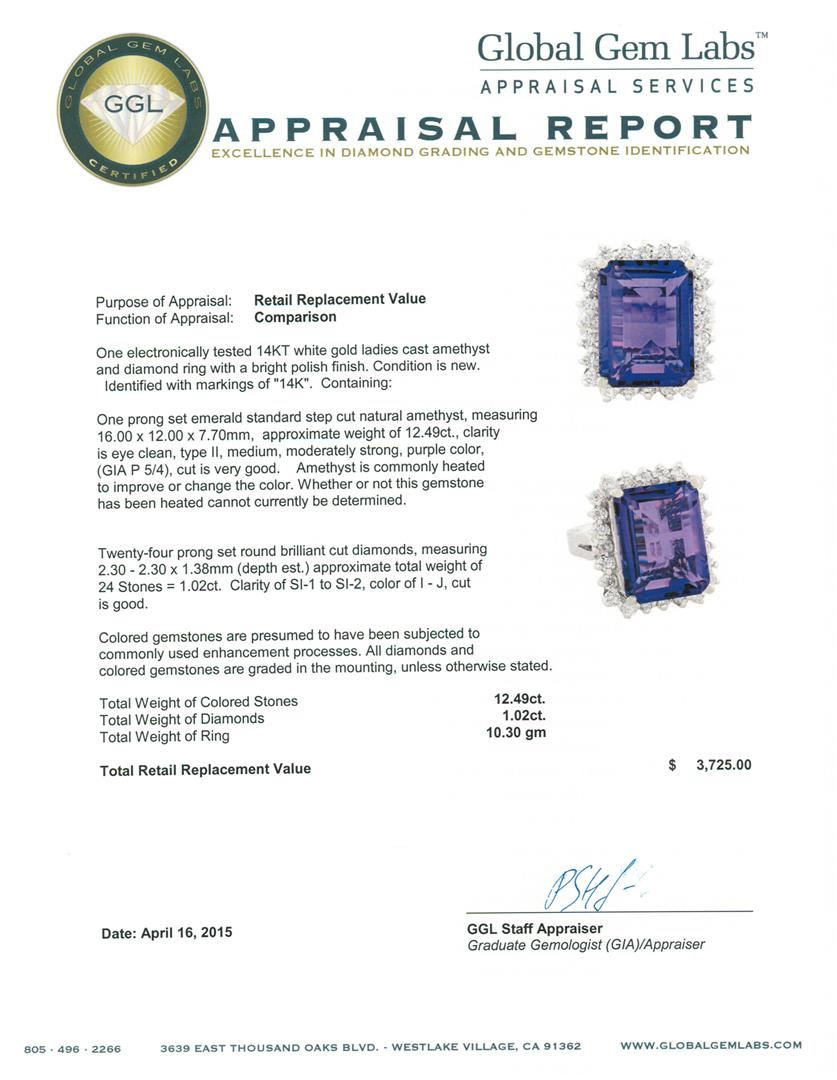One electronically tested 14KT white gold ladies cast amethyst and diamond ring with a bright polish finish. Identified with markings of "14K". Condition is new. Containing: One prong set emerald standard step cut natural amethyst, measuring 16.00 x 12.00 x 7.70mm, approximate weight of 12.49ct., clarity is eye clean, type II, medium, moderately strong, purple color, (GIA P 5/4), cut is very good. Amethyst is commonly heated to improve or change the color. Whether or not this gemstone has been heated cannot currently be determined. Twenty-Four prong set round brilliant cut diamonds, measuring 2.30 - 2.30 x 1.38mm (depth est.) approximate total weight of 24 Stones = 1.02ct. Clarity: SI-1 to SI-2. Color: I - J, Cut is Good. Colored gemstones are presumed to have been subjected to commonly used enhancement processes. All diamonds and colored gemstones are graded in the mounting, unless otherwise stated. Total Weight of Colored Stones 12.49ct. Total Weight of Diamonds 1.02ct. Total Weight of Ring 10.30 grams. GGL Appraised at $3,725.00.