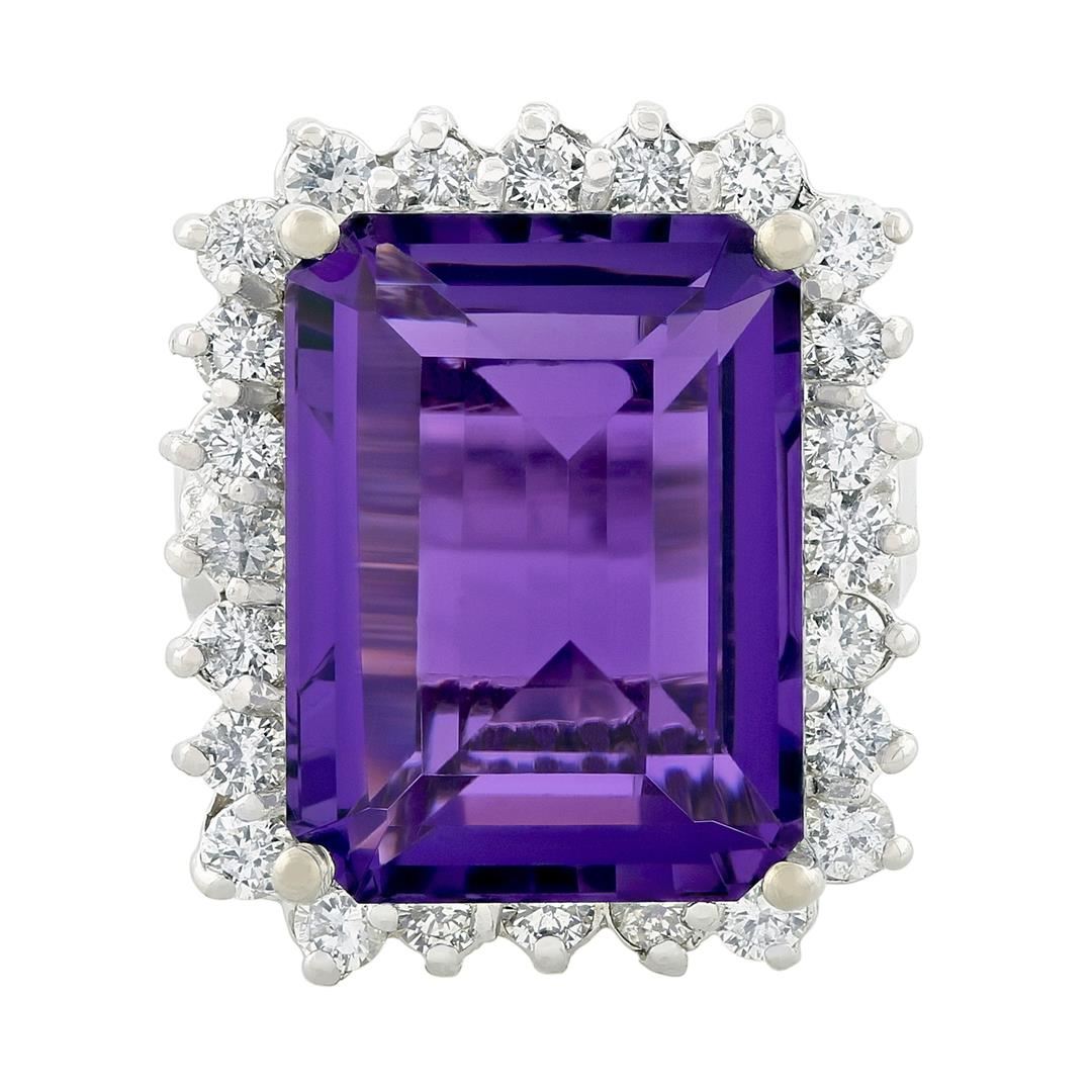 One electronically tested 14KT white gold ladies cast amethyst and diamond ring with a bright polish finish. Identified with markings of "14K". Condition is new. Containing: One prong set emerald standard step cut natural amethyst, measuring 16.00 x 12.00 x 7.70mm, approximate weight of 12.49ct., clarity is eye clean, type II, medium, moderately strong, purple color, (GIA P 5/4), cut is very good. Amethyst is commonly heated to improve or change the color. Whether or not this gemstone has been heated cannot currently be determined. Twenty-Four prong set round brilliant cut diamonds, measuring 2.30 - 2.30 x 1.38mm (depth est.) approximate total weight of 24 Stones = 1.02ct. Clarity: SI-1 to SI-2. Color: I - J, Cut is Good. Colored gemstones are presumed to have been subjected to commonly used enhancement processes. All diamonds and colored gemstones are graded in the mounting, unless otherwise stated. Total Weight of Colored Stones 12.49ct. Total Weight of Diamonds 1.02ct. Total Weight of Ring 10.30 grams. GGL Appraised at $3,725.00.