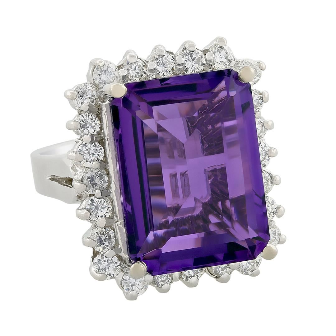 One electronically tested 14KT white gold ladies cast amethyst and diamond ring with a bright polish finish. Identified with markings of "14K". Condition is new. Containing: One prong set emerald standard step cut natural amethyst, measuring 16.00 x 12.00 x 7.70mm, approximate weight of 12.49ct., clarity is eye clean, type II, medium, moderately strong, purple color, (GIA P 5/4), cut is very good. Amethyst is commonly heated to improve or change the color. Whether or not this gemstone has been heated cannot currently be determined. Twenty-Four prong set round brilliant cut diamonds, measuring 2.30 - 2.30 x 1.38mm (depth est.) approximate total weight of 24 Stones = 1.02ct. Clarity: SI-1 to SI-2. Color: I - J, Cut is Good. Colored gemstones are presumed to have been subjected to commonly used enhancement processes. All diamonds and colored gemstones are graded in the mounting, unless otherwise stated. Total Weight of Colored Stones 12.49ct. Total Weight of Diamonds 1.02ct. Total Weight of Ring 10.30 grams. GGL Appraised at $3,725.00.