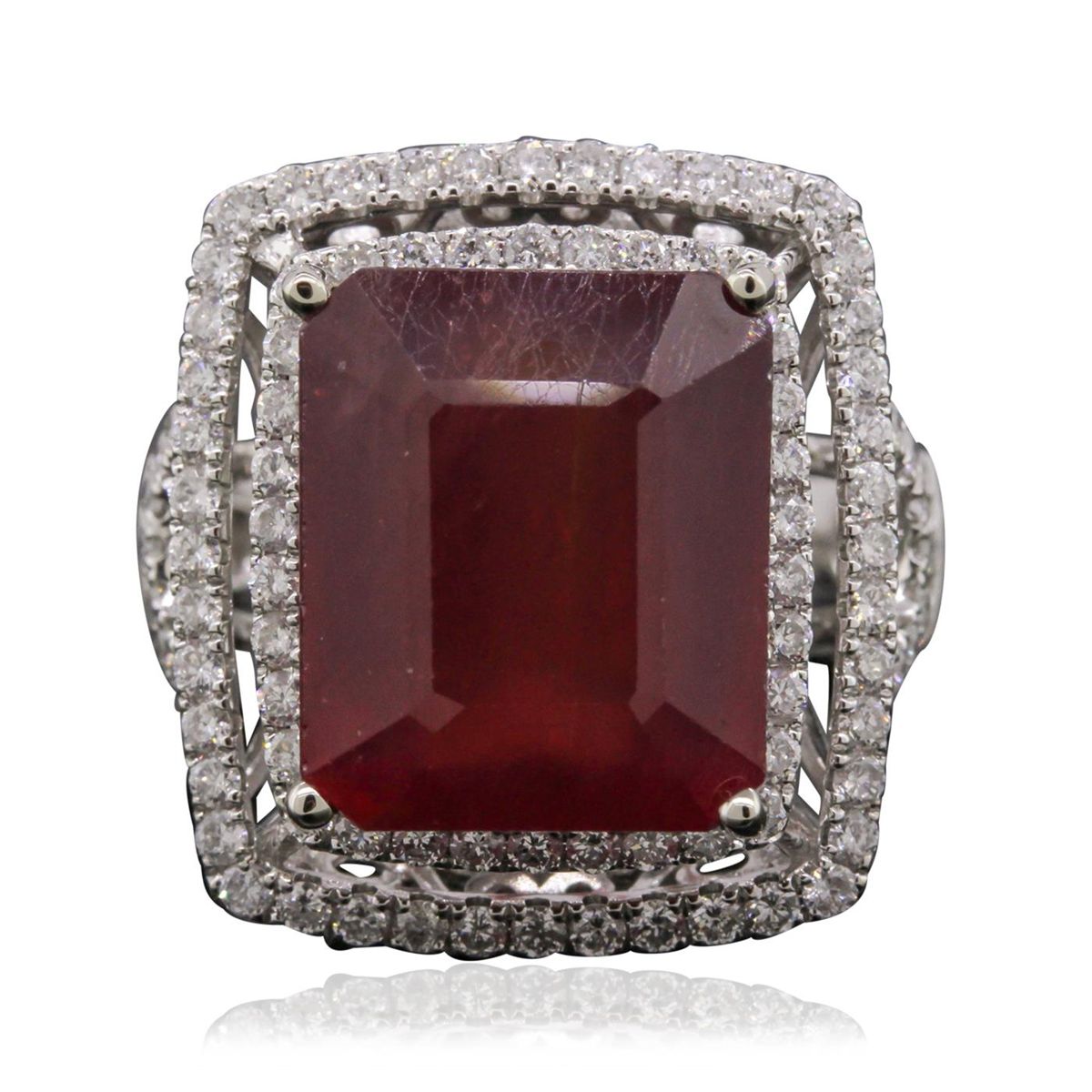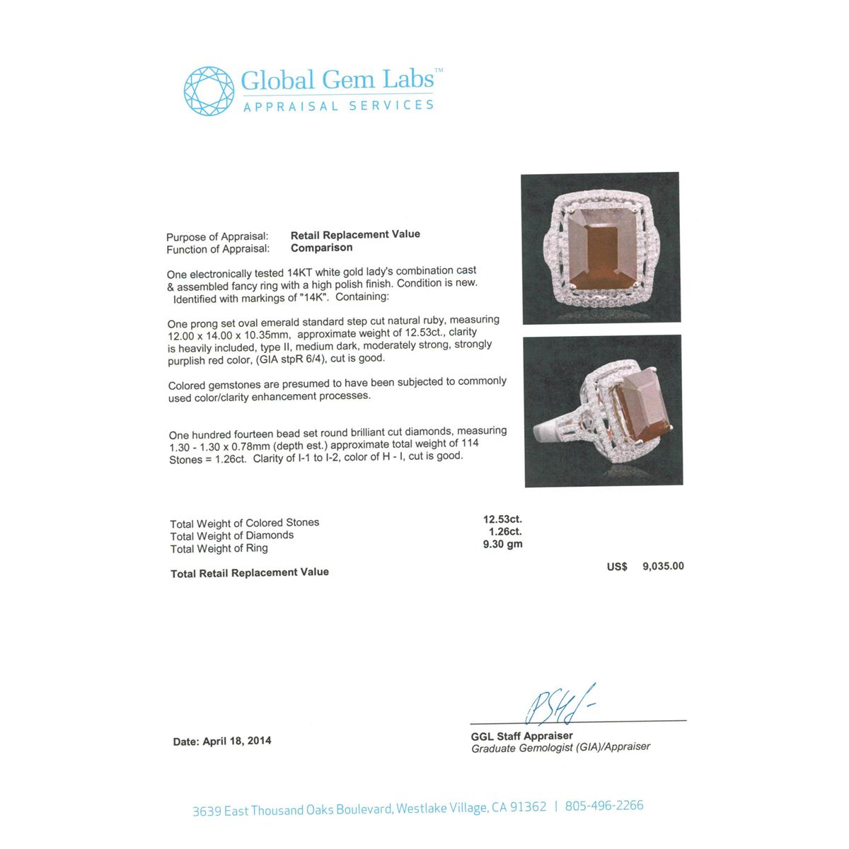One electronically tested 14KT white gold Ladies combination cast & assembled fancy ring with a high polish finish. Condition is new. Identified with markings of "14K". Containing: One prong set oval emerald standard step cut natural ruby, measuring 12.00 x 14.00 x 10.35mm, approximate weight of 12.53ct., clarity is heavily included, type II, medium dark, moderately strong, strongly purplish red color, (GIA stpR 6/4), cut is good. Colored gemstones are presumed to have been subjected to commonly used color/clarity enhancement processes. One Hundred Fourteen bead set round brilliant cut diamonds, measuring 1.30 - 1.30 x 0.78mm (depth est.) approximate. Total Weight of 114 Stones = 1.26ct. Clarity: I-1 to I-2. Color: H - I, Cut is Good. Total Weight of Colored Stones 12.53ct. Total Weight of Diamonds 1.26ct. Total Weight of Ring 9.30 grams. GGL Appraised at $9,035.00.