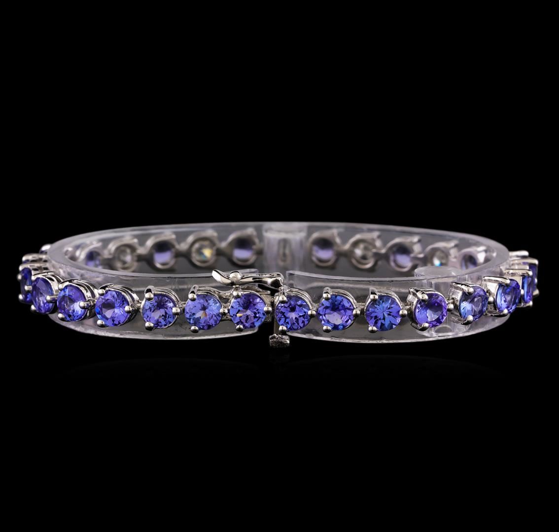 One electronically tested 14KT white gold ladies combination cast & assembled tanzanite and diamond bracelet with a hidden box clasp with a bright polish finish. Measurements: 7.25" in length. Identified with markings of "14K". Condition is new. Containing: Twenty-four prong set round modified brilliant cut natural tanzanites, measuring 5.00 - 5.00 x 3.25 mm, approximate total weight of 12.96ct., clarity is eye clean, type I, medium light, very slightly grayish, violet color, (GIA V 4/3), cut is good. Five prong set round brilliant cut diamonds, measuring 4.50 - 4.50 x 2.70mm (depth est.) approximate total weight of 5 Stones = 1.67ct. Clarity: I-2 to I-3. Color: I - J, Cut is Good. Colored gemstones are presumed to have been subjected to commonly used enhancement processes. All diamonds and colored gemstones are graded in the mounting, unless otherwise stated. Total Weight of Colored Stones 12.96ct. Total Weight of Diamonds 1.67ct. Total Weight of Bracelet 16.90 grams. GGL Appraised at $11,525.00.
