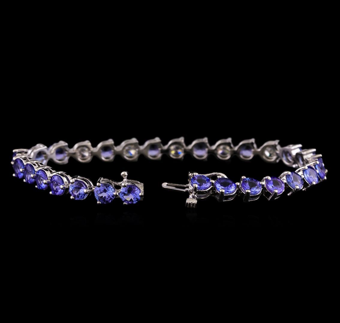 One electronically tested 14KT white gold ladies combination cast & assembled tanzanite and diamond bracelet with a hidden box clasp with a bright polish finish. Measurements: 7.25" in length. Identified with markings of "14K". Condition is new. Containing: Twenty-four prong set round modified brilliant cut natural tanzanites, measuring 5.00 - 5.00 x 3.25 mm, approximate total weight of 12.96ct., clarity is eye clean, type I, medium light, very slightly grayish, violet color, (GIA V 4/3), cut is good. Five prong set round brilliant cut diamonds, measuring 4.50 - 4.50 x 2.70mm (depth est.) approximate total weight of 5 Stones = 1.67ct. Clarity: I-2 to I-3. Color: I - J, Cut is Good. Colored gemstones are presumed to have been subjected to commonly used enhancement processes. All diamonds and colored gemstones are graded in the mounting, unless otherwise stated. Total Weight of Colored Stones 12.96ct. Total Weight of Diamonds 1.67ct. Total Weight of Bracelet 16.90 grams. GGL Appraised at $11,525.00.