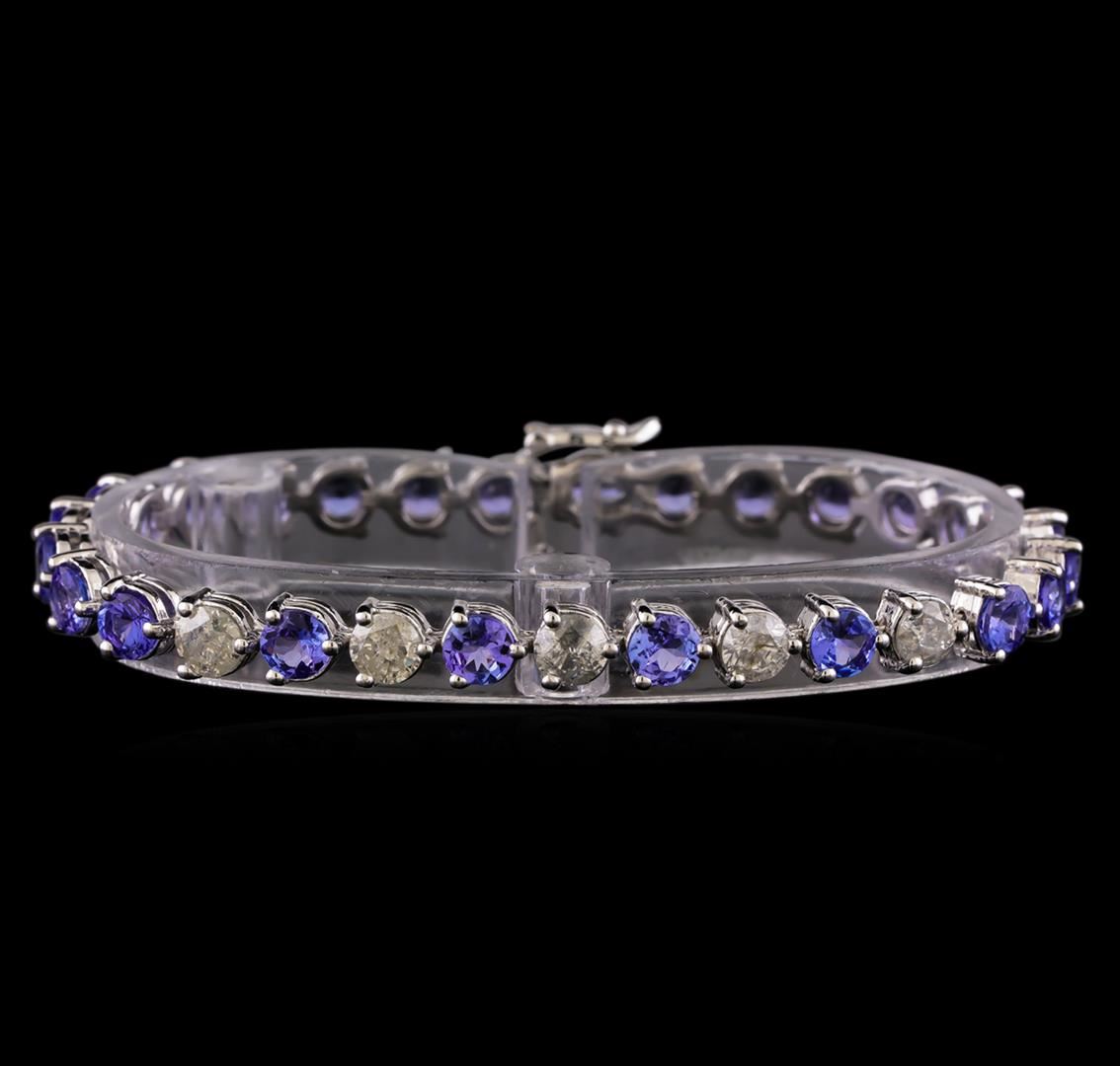 One electronically tested 14KT white gold ladies combination cast & assembled tanzanite and diamond bracelet with a hidden box clasp with a bright polish finish. Measurements: 7.25" in length. Identified with markings of "14K". Condition is new. Containing: Twenty-four prong set round modified brilliant cut natural tanzanites, measuring 5.00 - 5.00 x 3.25 mm, approximate total weight of 12.96ct., clarity is eye clean, type I, medium light, very slightly grayish, violet color, (GIA V 4/3), cut is good. Five prong set round brilliant cut diamonds, measuring 4.50 - 4.50 x 2.70mm (depth est.) approximate total weight of 5 Stones = 1.67ct. Clarity: I-2 to I-3. Color: I - J, Cut is Good. Colored gemstones are presumed to have been subjected to commonly used enhancement processes. All diamonds and colored gemstones are graded in the mounting, unless otherwise stated. Total Weight of Colored Stones 12.96ct. Total Weight of Diamonds 1.67ct. Total Weight of Bracelet 16.90 grams. GGL Appraised at $11,525.00.