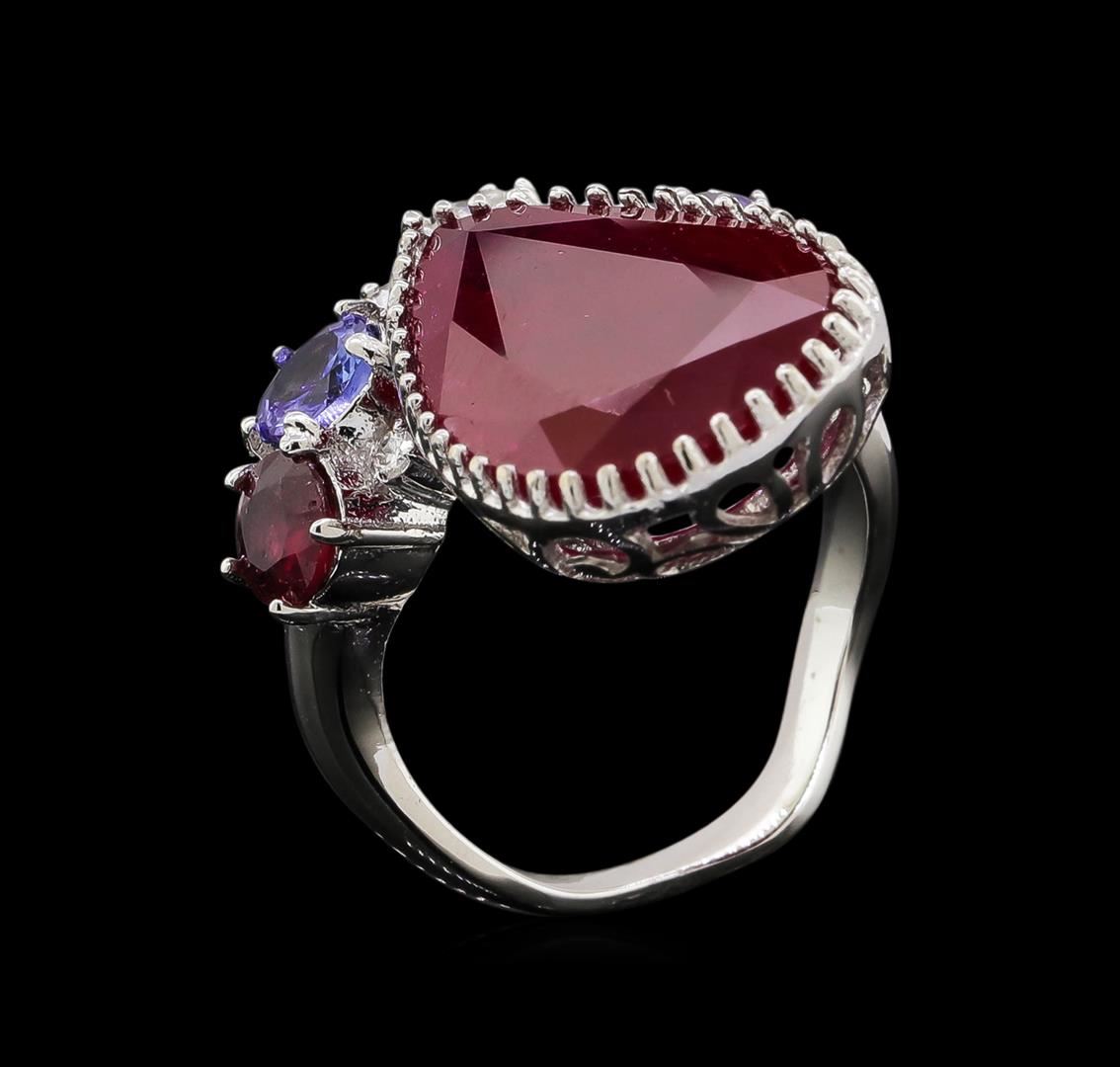 One electronically tested 14KT white gold ladies cast ruby, tanzanite and diamond ring with a bright polish finish. Identified with markings of "14K". Condition is new. Containing: One bezel set pear modified brilliant cut natural ruby, measuring 20.43 x 13.97 x 5.10mm, approximate weight of 11.79ct., clarity is heavily included, medium dark, moderately strong, strongly purplish red color, (GIA stpR 6/4), cut is good. Two prong set round modified brilliant cut natural rubies, measuring 5.00 - 5.00 x 3.25 mm, approximate total weight of 1.30ct., clarity is heavily included, type II, medium dark, very slightly brownish, strongly purplish red color, (GIA stpR 6/3), cut is good. Two prong set round modified brilliant cut natural tanzanites, measuring 5.00 - 5.00 x 3.25 mm, approximate total weight of 1.08ct., clarity is eye clean, type I, medium light, very slightly grayish, violet color, (GIA V 4/3), cut is good. One prong set round brilliant cut diamond, measuring 3.50 - 3.50 x 2.10mm (depth est.) approximate weight of 0.16ct. Clarity: I-2. Color: J, Cut is Good. Eleven prong set round brilliant cut diamonds, measuring 1.50 - 1.30 x 0.84mm (depth est.) approximate total weight of 11 Stones = 0.11ct. Clarity: SI-2 to I-1. Color: J, Cut is Good. Colored gemstones are presumed to have been subjected to commonly used enhancement processes. All diamonds and colored gemstones are graded in the mounting, unless otherwise stated. Total Weight of Colored Stones 14.17ct. Total Weight of Diamonds 0.27ct. Total Weight of Ring 10.70 grams. GGL Appraised at $4,710.00.