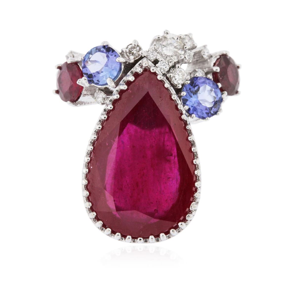 One electronically tested 14KT white gold ladies cast ruby, tanzanite and diamond ring with a bright polish finish. Identified with markings of "14K". Condition is new. Containing: One bezel set pear modified brilliant cut natural ruby, measuring 20.43 x 13.97 x 5.10mm, approximate weight of 11.79ct., clarity is heavily included, medium dark, moderately strong, strongly purplish red color, (GIA stpR 6/4), cut is good. Two prong set round modified brilliant cut natural rubies, measuring 5.00 - 5.00 x 3.25 mm, approximate total weight of 1.30ct., clarity is heavily included, type II, medium dark, very slightly brownish, strongly purplish red color, (GIA stpR 6/3), cut is good. Two prong set round modified brilliant cut natural tanzanites, measuring 5.00 - 5.00 x 3.25 mm, approximate total weight of 1.08ct., clarity is eye clean, type I, medium light, very slightly grayish, violet color, (GIA V 4/3), cut is good. One prong set round brilliant cut diamond, measuring 3.50 - 3.50 x 2.10mm (depth est.) approximate weight of 0.16ct. Clarity: I-2. Color: J, Cut is Good. Eleven prong set round brilliant cut diamonds, measuring 1.50 - 1.30 x 0.84mm (depth est.) approximate total weight of 11 Stones = 0.11ct. Clarity: SI-2 to I-1. Color: J, Cut is Good. Colored gemstones are presumed to have been subjected to commonly used enhancement processes. All diamonds and colored gemstones are graded in the mounting, unless otherwise stated. Total Weight of Colored Stones 14.17ct. Total Weight of Diamonds 0.27ct. Total Weight of Ring 10.70 grams. GGL Appraised at $4,710.00.