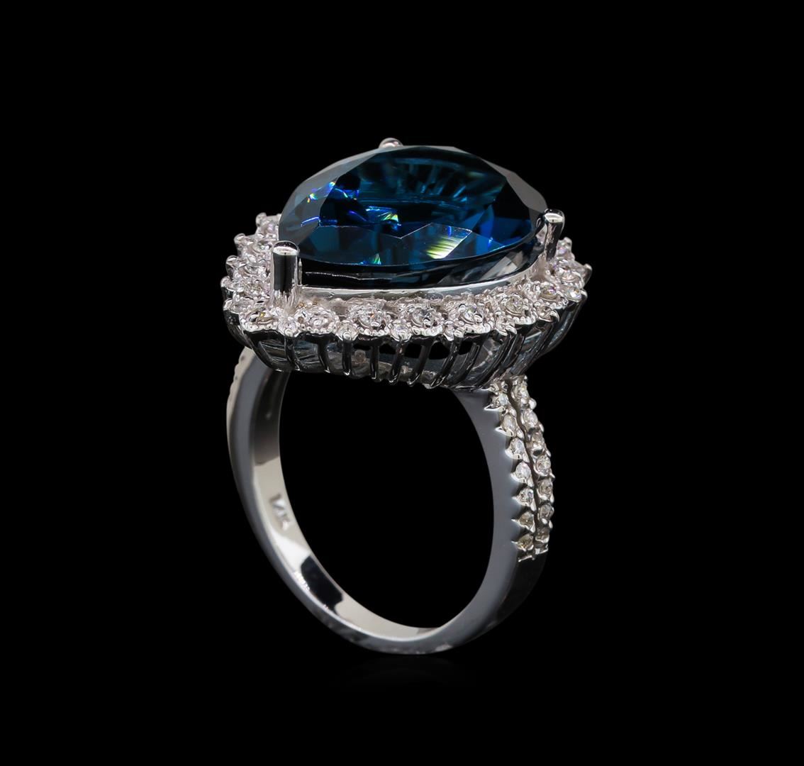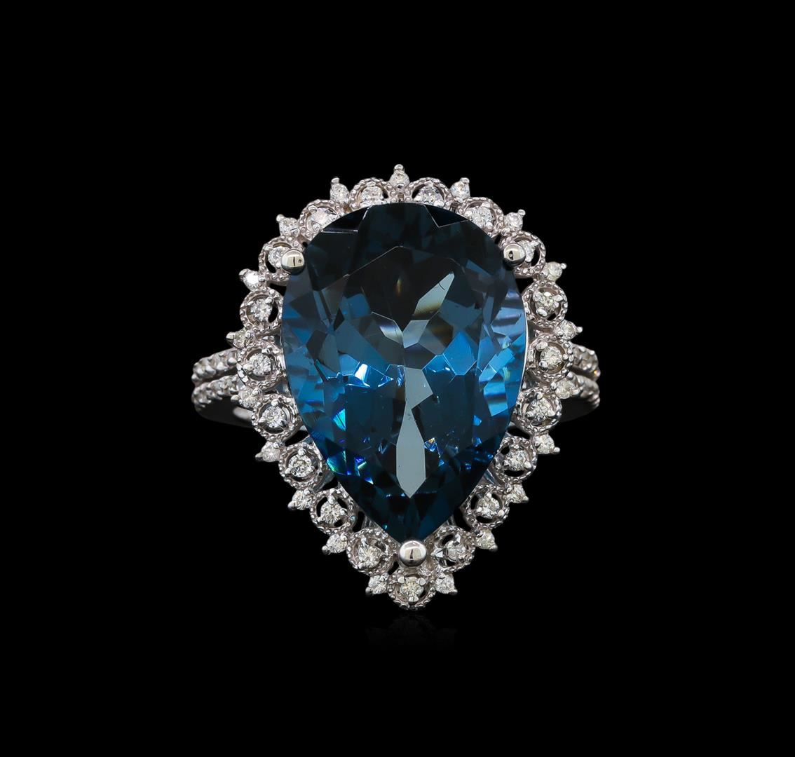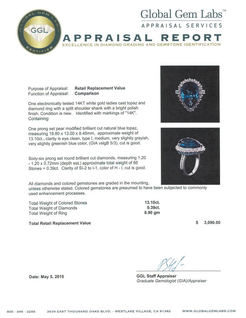 One electronically tested 14KT white gold ladies cast topaz and diamond ring with a split shoulder shank with a bright polish finish. Identified with markings of "14K". Condition is new. Containing: One prong set pear modified brilliant cut natural blue topaz, measuring 18.80 x 13.00 x 8.45mm, approximate weight of 13.10ct., clarity is eye clean, type I, medium, very slightly grayish, very slightly greenish blue color, (GIA vslgB 5/3), cut is good. Sixty-Six prong set round brilliant cut diamonds, measuring 1.20 - 1.20 x 0.72mm (depth est.) approximate total weight of 66 Stones = 0.39ct. Clarity: SI-2 to I-1. Color: H - I, Cut is Good. All diamonds and colored gemstones are graded in the mounting, unless otherwise stated. Colored gemstones are presumed to have been subjected to commonly used enhancement processes.. Total Weight of Colored Stones 13.10ct. Total Weight of Diamonds 0.39ct. Total Weight of Ring 8.90 grams. GGL Appraised at $3,090.00.