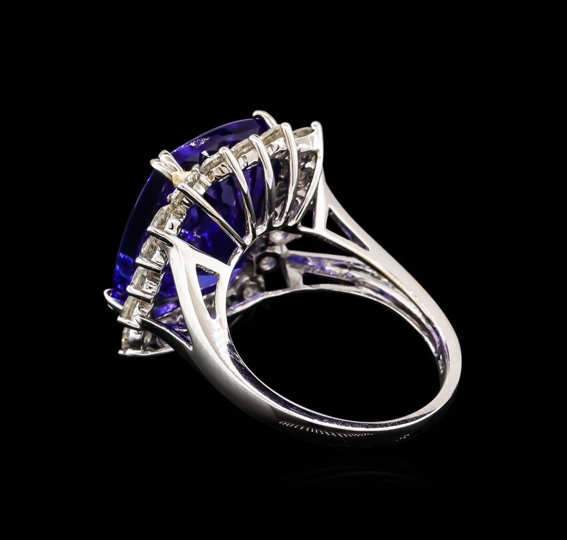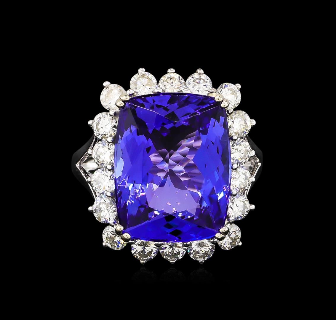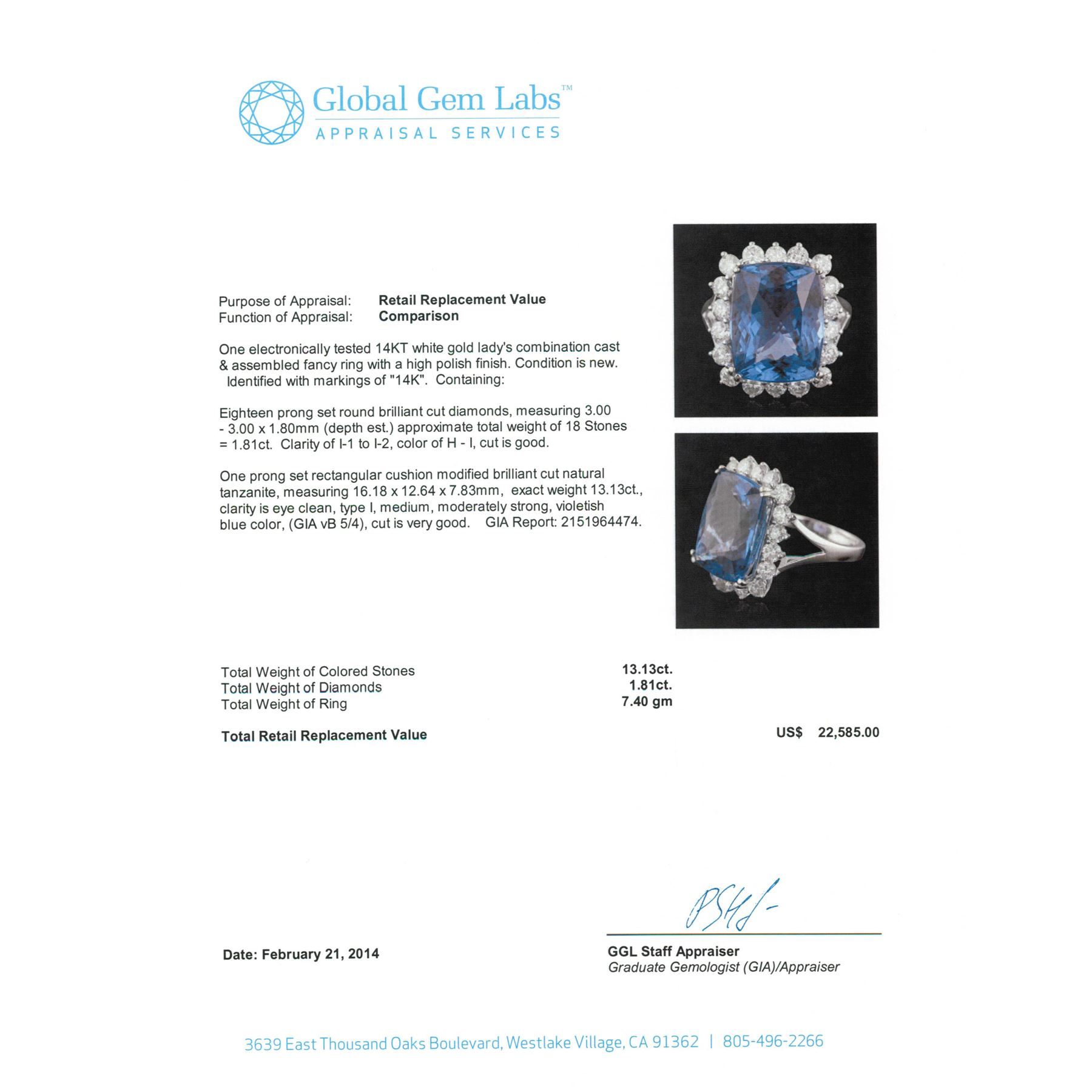 One electronically tested 14KT white gold Ladies combination cast & assembled fancy ring with a high polish finish. Identified with markings of "14K". Condition is new. Containing: Eighteen prong set round brilliant cut diamonds, measuring 3.00 - 3.00 x 1.80mm (depth est.) approximate. Total Weight of 18 Stones = 1.81ct. Clarity: I-1 to I-2. Color: H - I, Cut is Good. One prong set rectangular cushion modified brilliant cut natural tanzanite, measuring 16.18 x 12.64 x 7.83mm, exact weight 13.13ct., clarity is eye clean, type I, medium, moderately strong, violetish blue color, (GIA vB 5/4), cut is very good. GIA Report: 2151964474.Total Weight of Colored Stones 13.13ct. Total Weight of Diamonds 1.81ct. Total Weight of Ring 7.40gm. GGL Appraised at $22,585.00.