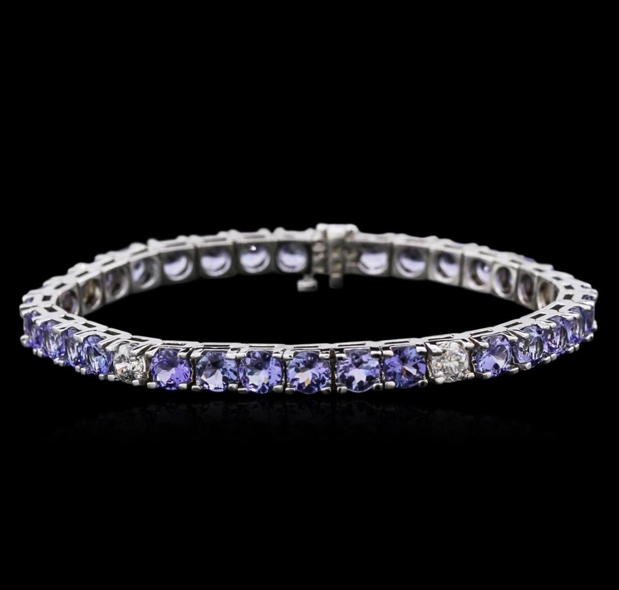 One electronically tested 14KT white gold ladies cast tanzanite and diamond bracelet with a hidden box clasp with safety closer with a bright polish finish. Measurements: 7" in length Identified with markings of "14K". Condition is new. Containing: Thirty prong set round modified brilliant cut natural tanzanites, measuring 5.00 - 5.00 x 3.25 mm, approximate total weight of 13.13ct., clarity is eye clean, type I, medium light, very slightly grayish, violet color, (GIA V 4/3), cut is good. Five prong set round brilliant cut diamonds, measuring 4.80 - 4.80 x 2.88mm (depth est.) approximate total weight of 5 Stones = 2.30ct. Clarity: I-1 to I-2. Color: I - J, Cut is Good. Colored gemstones are presumed to have been subjected to commonly used enhancement processes. All diamonds and colored gemstones are graded in the mounting, unless otherwise stated. Total Weight of Colored Stones 13.13ct. Total Weight of Diamonds 2.30ct. Total Weight of Bracelet 20.70 grams. GGL Appraised.