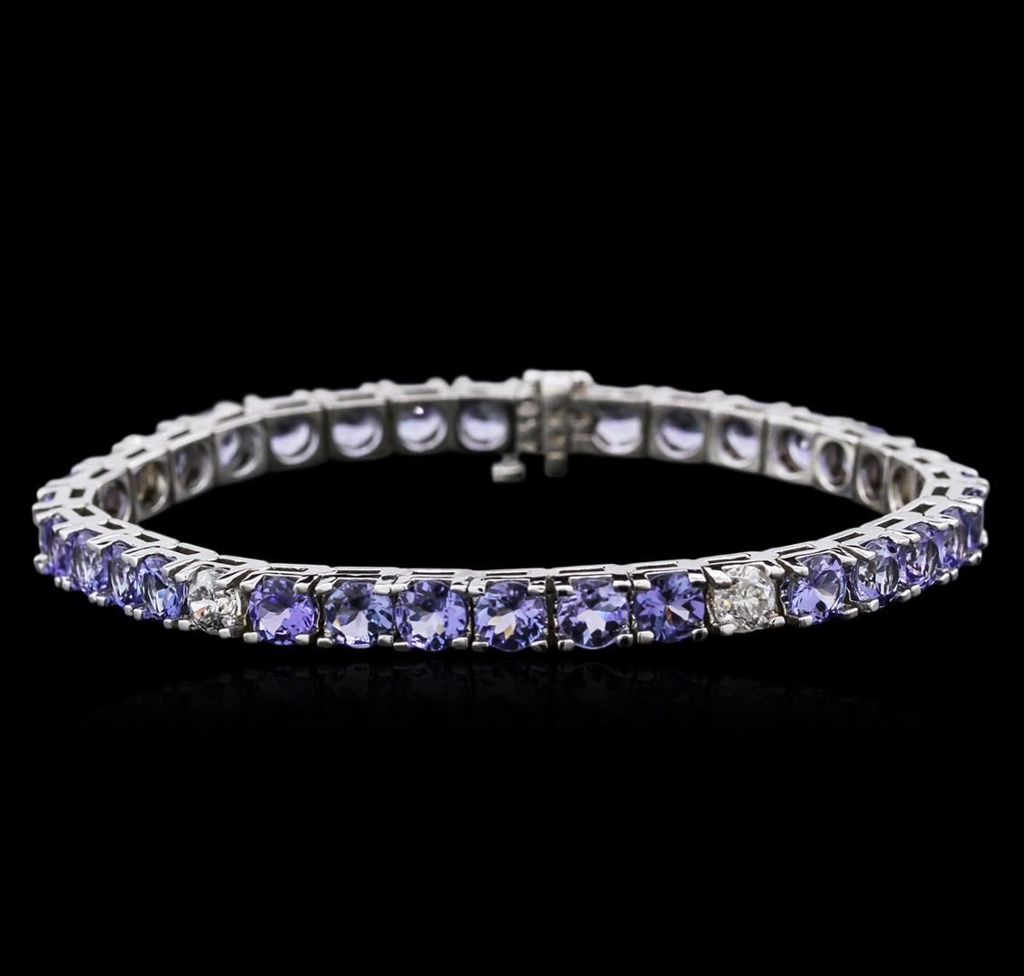 One electronically tested 14KT white gold ladies cast tanzanite and diamond bracelet with a hidden box clasp with safety closer with a bright polish finish. Measurements: 7" in length Identified with markings of "14K". Condition is new. Containing: Thirty prong set round modified brilliant cut natural tanzanites, measuring 5.00 - 5.00 x 3.25 mm, approximate total weight of 13.13ct., clarity is eye clean, type I, medium light, very slightly grayish, violet color, (GIA V 4/3), cut is good. Five prong set round brilliant cut diamonds, measuring 4.80 - 4.80 x 2.88mm (depth est.) approximate total weight of 5 Stones = 2.30 ct. Clarity: I-1 to I-2. Color: I - J, Cut is Good. Colored gemstones are presumed to have been subjected to commonly used enhancement processes. All diamonds and colored gemstones are graded in the mounting, unless otherwise stated. Total Weight of Colored Stones 13.13ct. Total Weight of Diamonds 2.30 ct. Total Weight of Bracelet 20.70 grams. GGL Appraised.