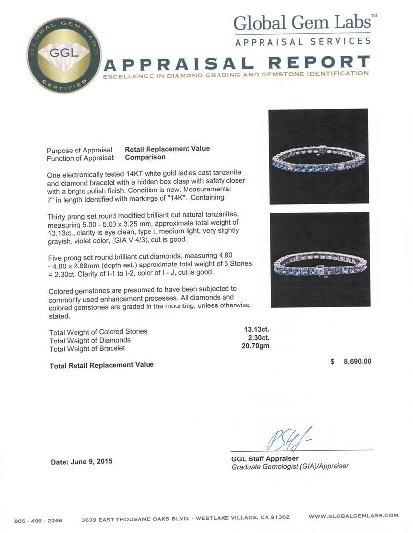 One electronically tested 14KT white gold ladies cast tanzanite and diamond bracelet with a hidden box clasp with safety closer with a bright polish finish. Measurements: 7" in length Identified with markings of "14K". Condition is new. Containing: Thirty prong set round modified brilliant cut natural tanzanites, measuring 5.00 - 5.00 x 3.25 mm, approximate total weight of 13.13ct., clarity is eye clean, type I, medium light, very slightly grayish, violet color, (GIA V 4/3), cut is good. Five prong set round brilliant cut diamonds, measuring 4.80 - 4.80 x 2.88mm (depth est.) approximate total weight of 5 Stones = 2.30 ct. Clarity: I-1 to I-2. Color: I - J, Cut is Good. Colored gemstones are presumed to have been subjected to commonly used enhancement processes. All diamonds and colored gemstones are graded in the mounting, unless otherwise stated. Total Weight of Colored Stones 13.13ct. Total Weight of Diamonds 2.30 ct. Total Weight of Bracelet 20.70 grams. GGL Appraised.