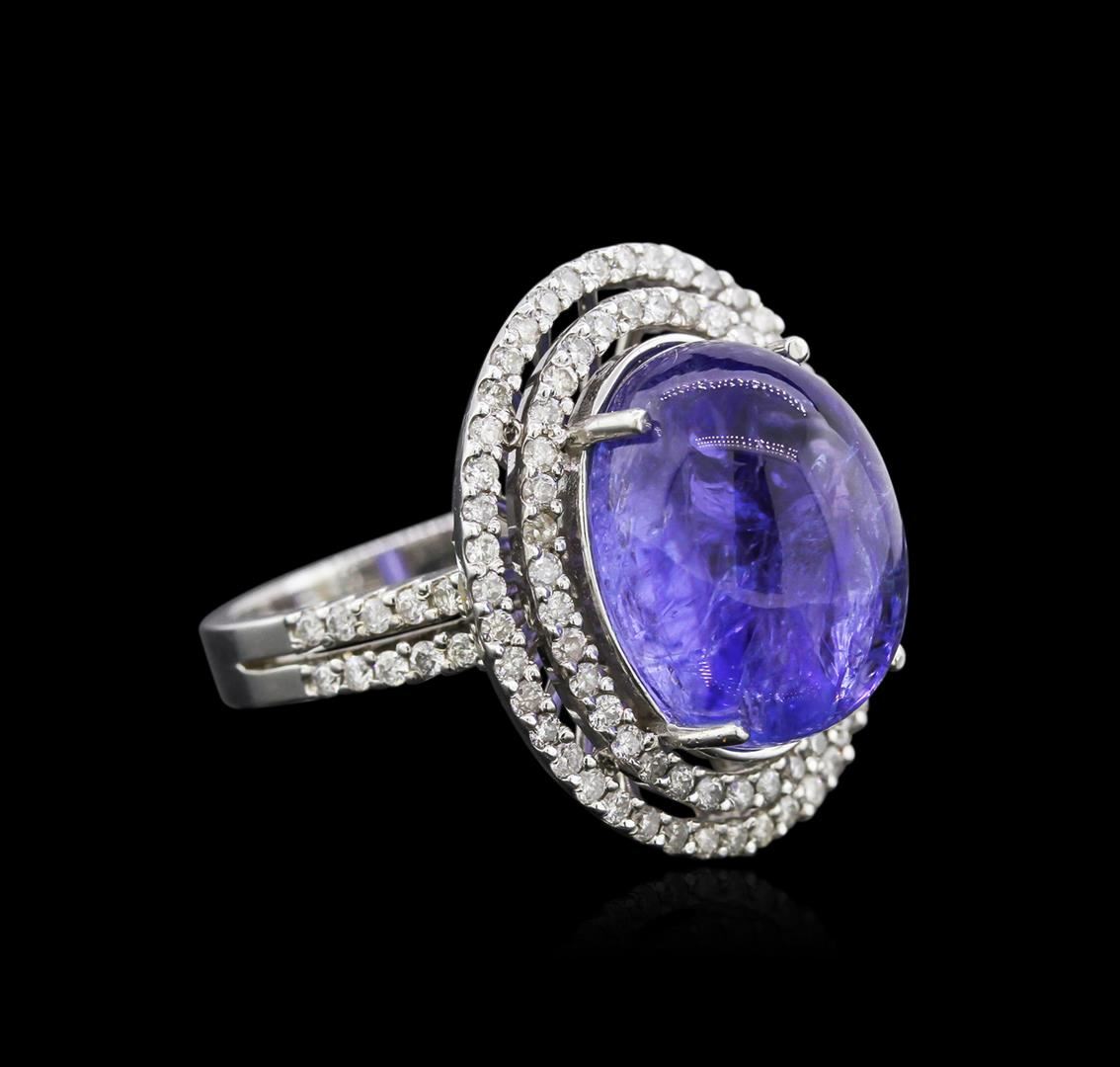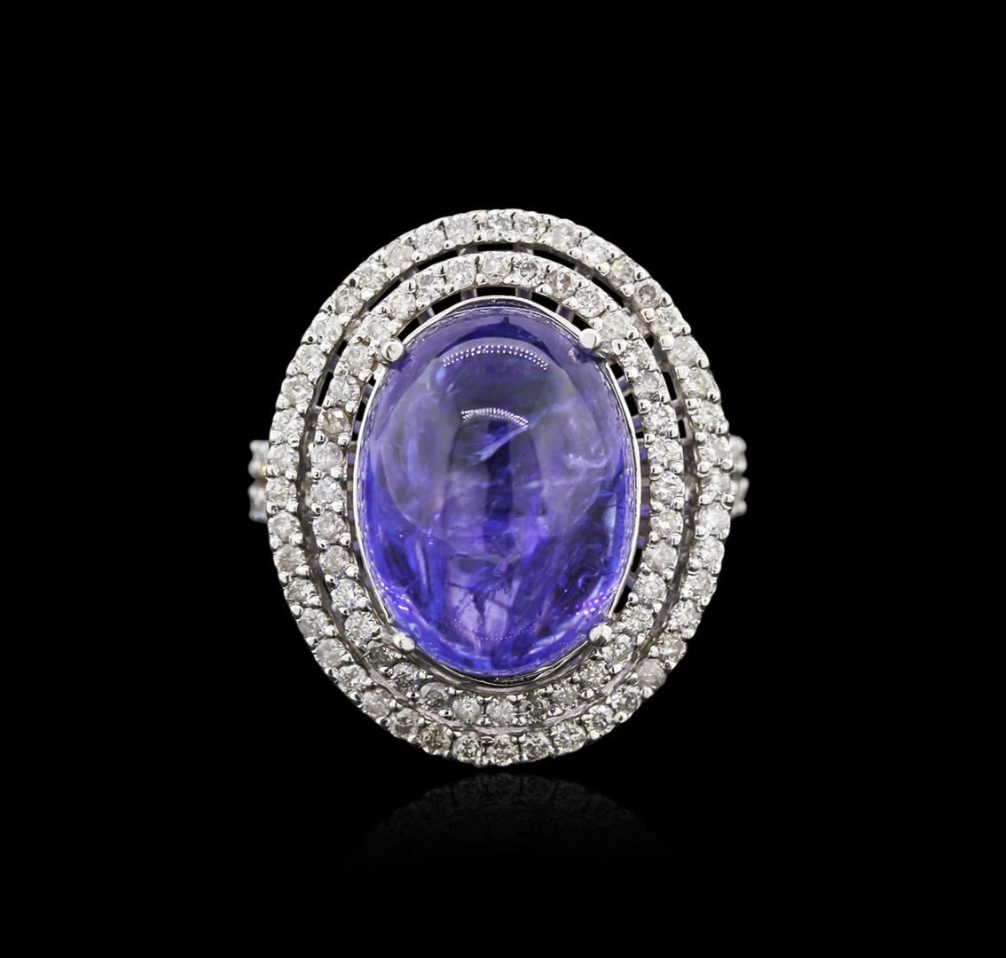One ring featuring: 14KT white gold weighing 7.50 grams containing one tanzanite center stone with a total weight of 13.17ct and 102 round diamonds with a total weight of 0.96ct.