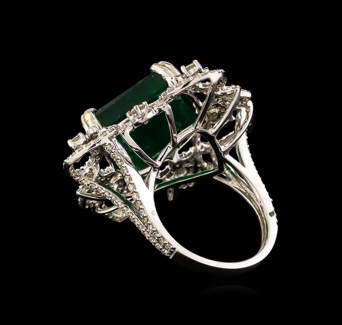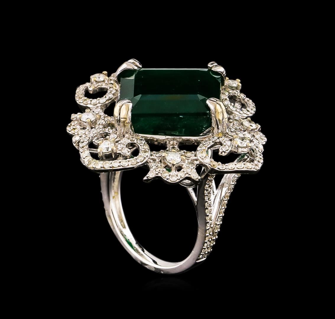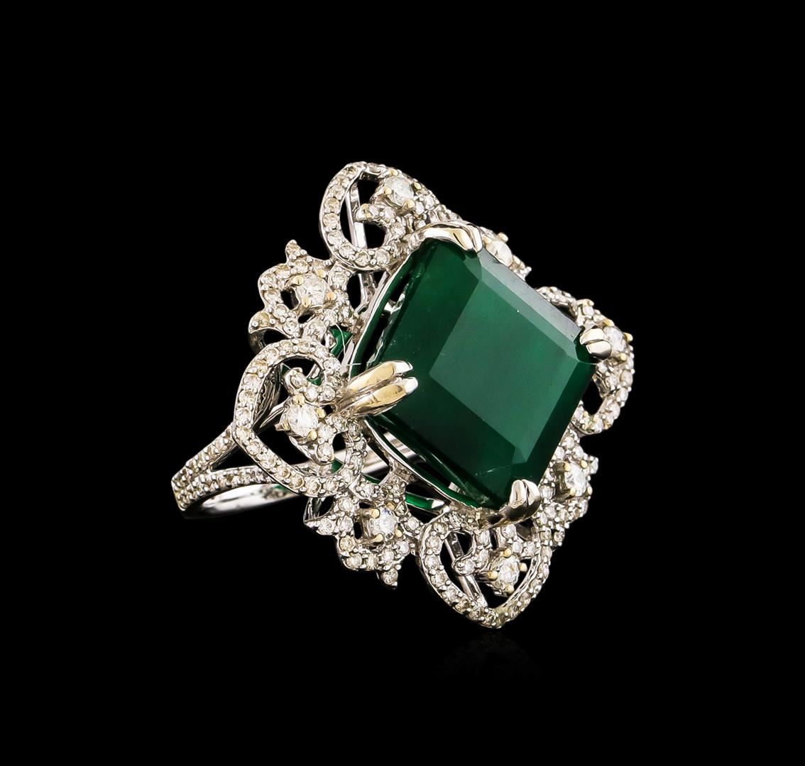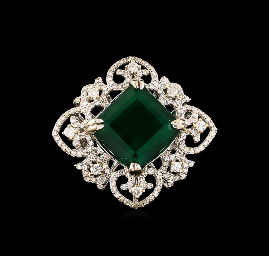 One electronically tested 14KT white gold ladies combination cast & assembled ring with a bright polish finish. Condition is new. Identified with markings of "14K". Containing: One prong set emerald standard brilliant cut natural emerald, measuring 13.90 x 13.60 x 9.52mm, approximate weight of 13.22ct., clarity is heavily included, type III, medium dark, moderately strong, green color, (GIA G 6/4), cut is good. Eight prong set round brilliant cut diamonds, measuring 2.00 - 2.00 x 1.20mm (depth est.) approximate total weight of 8 Stones = 0.23ct. Clarity: I-1 to I-2. Color: H - I, Cut is Good. Two Hundred Eight prong set round brilliant cut diamonds, measuring 1.20 - 1.20 x 0.72mm (depth est.) approximate total weight of 208 Stones = 1.31ct. Clarity: I-1 to I-2. Color: H - I, Cut is Good. Colored gemstones are presumed to have been subjected to commonly used enhancement processes. All diamonds and colored gemstones are graded in the mounting, unless otherwise stated. Total Weight of Colored Stones 13.22ct. Total Weight of Diamonds 1.54ct. Total Weight of Ring 10.30 grams. GGL Appraised at $17,525.00.
